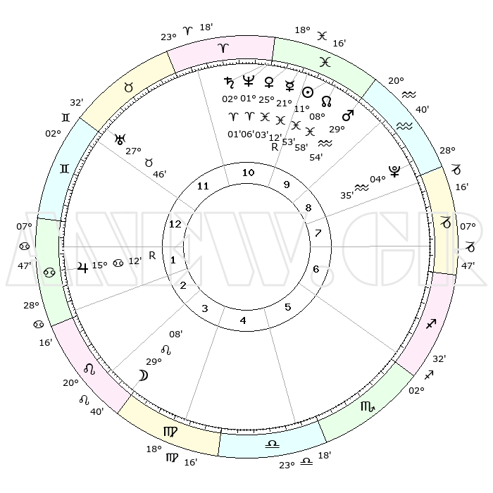 | | ΘΕΣΕΙΣ ΠΛΑΝΗΤΩΝ ΑΣΤΡΟΛΟΓΙΚΟΥ ΧΑΡΤΗ ΤΗΣ ΣΤΙΓΜΗΣ ΑΥΤΗΣ | | | | Πλανήτης | Ζώδιο | Μοίρες | Δεκαήμ. | Σε οίκο | Απόκλιση | | Ακμές των οίκων | | Ηλιος | Ιχθείς | 11°48' | Δεύτερο | 10 | 07 S 08 | | 1ος | 15°06' | Δίδυμοι | | Σελήνη | Λέων | 28°13' | Τρίτο | 4 | 13 N 01 | | 2ος | 07°21' | Καρκίνος | | Ερμής | Ιχθείς | 21°14'R | Τρίτο | 10 | 00 S 16 | | 3ος | 28°35' | Καρκίνος | | Αφροδίτη | Ιχθείς | 24°58' | Τρίτο | 11 | 03 S 14 | | 4ος | 22°48' | Λέων | | Αρης | Υδροχόος | 29°51' | Τρίτο | 10 | 12 S 33 | | 5ος | 24°03' | Παρθένος | | Δίας | Καρκίνος | 15°13'R | Δεύτερο | 2 | 22 N 55 | | 6ος | 04°10' | Σκορπιός | | Κρόνος | Κριός | 02°00' | Πρώτο | 11 | 01 S 09 | | 7ος | 15°06' | Τοξότης | | Ουρανός | Ταύρος | 27°46' | Τρίτο | 12 | 19 N 29 | | 8ος | 07°21' | Αιγόκερως | | Ποσειδώνας | Κριός | 01°06' | Πρώτο | 11 | 00 S 46 | | 9ος | 28°35' | Αιγόκερως | | Πλούτωνας | Υδροχόος | 04°34' | Πρώτο | 9 | 22 S 52 | | 10ος | 22°48' | Υδροχόος | | Β. Δεσμός | Ιχθείς | 08°58' | Πρώτο | 10 | 08 S 12 | | 11ος | 24°03' | Ιχθείς | | Ωροσκόπος | Δίδυμοι | 15°06' | Δεύτερο | | | 12ος | 04°10' | Ταύρος | | Μεσουράνημα | Υδροχόος | 22°48' | Τρίτο | | | |