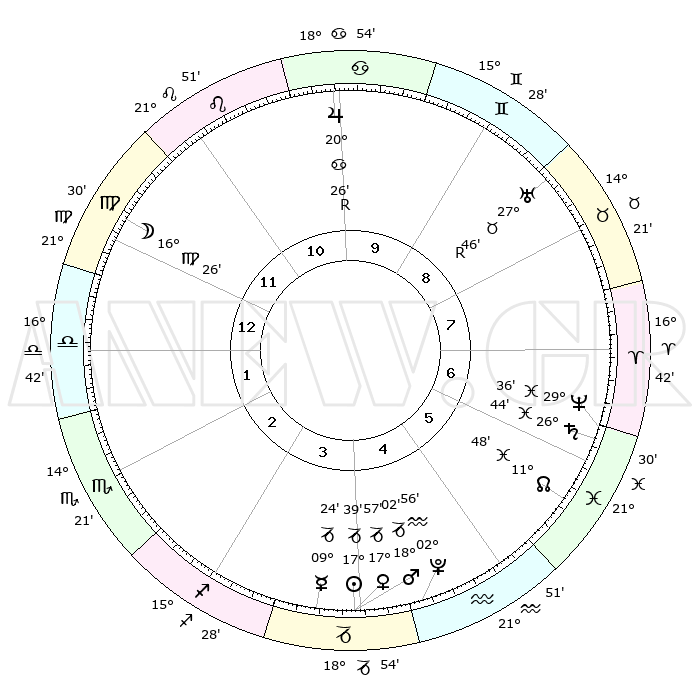 | | ΘΕΣΕΙΣ ΠΛΑΝΗΤΩΝ ΑΣΤΡΟΛΟΓΙΚΟΥ ΧΑΡΤΗ ΤΗΣ ΣΤΙΓΜΗΣ ΑΥΤΗΣ | | | | Πλανήτης | Ζώδιο | Μοίρες | Δεκαήμ. | Σε οίκο | Απόκλιση | | Ακμές των οίκων | | Ηλιος | Αιγόκερως | 16°32' | Δεύτερο | 4 | 22 S 25 | | 1ος | 19°54' | Παρθένος | | Σελήνη | Παρθένος | 02°01' | Πρώτο | 12 | 11 N 27 | | 2ος | 15°42' | Ζυγός | | Ερμής | Αιγόκερως | 07°42' | Πρώτο | 4 | 24 S 22 | | 3ος | 15°42' | Σκορπιός | | Αφροδίτη | Αιγόκερως | 16°35' | Δεύτερο | 4 | 23 S 07 | | 4ος | 18°38' | Τοξότης | | Αρης | Αιγόκερως | 17°12' | Δεύτερο | 4 | 23 S 15 | | 5ος | 21°49' | Αιγόκερως | | Δίας | Καρκίνος | 20°35'R | Τρίτο | 10 | 22 N 06 | | 6ος | 22°39' | Υδροχόος | | Κρόνος | Ιχθείς | 26°39' | Τρίτο | 7 | 03 S 23 | | 7ος | 19°54' | Ιχθείς | | Ουρανός | Ταύρος | 27°48'R | Τρίτο | 9 | 19 N 28 | | 8ος | 15°42' | Κριός | | Ποσειδώνας | Ιχθείς | 29°35' | Τρίτο | 7 | 01 S 23 | | 9ος | 15°42' | Ταύρος | | Πλούτωνας | Υδροχόος | 02°54' | Πρώτο | 5 | 23 S 11 | | 10ος | 18°38' | Δίδυμοι | | Β. Δεσμός | Ιχθείς | 11°52' | Δεύτερο | 6 | 07 S 07 | | 11ος | 21°49' | Καρκίνος | | Ωροσκόπος | Παρθένος | 19°54' | Δεύτερο | | | 12ος | 22°39' | Λέων | | Μεσουράνημα | Δίδυμοι | 18°38' | Δεύτερο | | | |