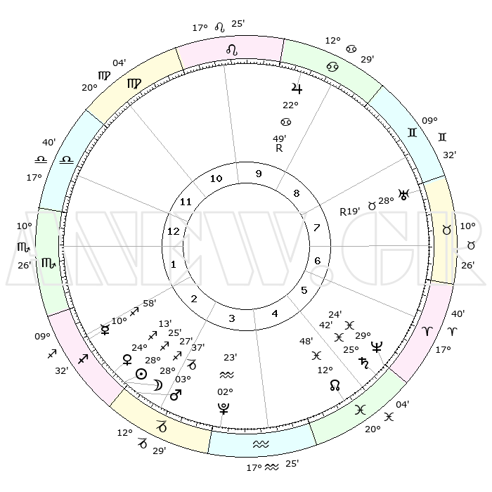 | | ΘΕΣΕΙΣ ΠΛΑΝΗΤΩΝ ΑΣΤΡΟΛΟΓΙΚΟΥ ΧΑΡΤΗ ΤΗΣ ΣΤΙΓΜΗΣ ΑΥΤΗΣ | | | | Πλανήτης | Ζώδιο | Μοίρες | Δεκαήμ. | Σε οίκο | Απόκλιση | | Ακμές των οίκων | | Ηλιος | Τοξότης | 28°21' | Τρίτο | 3 | 23 S 25 | | 1ος | 19°36' | Ζυγός | | Σελήνη | Τοξότης | 27°36' | Τρίτο | 3 | 28 S 14 | | 2ος | 17°25' | Σκορπιός | | Ερμής | Τοξότης | 10°52' | Δεύτερο | 2 | 21 S 11 | | 3ος | 18°42' | Τοξότης | | Αφροδίτη | Τοξότης | 24°07' | Τρίτο | 3 | 23 S 20 | | 4ος | 22°16' | Αιγόκερως | | Αρης | Αιγόκερως | 03°33' | Πρώτο | 3 | 24 S 12 | | 5ος | 25°13' | Υδροχόος | | Δίας | Καρκίνος | 22°50'R | Τρίτο | 10 | 21 N 42 | | 6ος | 24°42' | Ιχθείς | | Κρόνος | Ιχθείς | 25°42' | Τρίτο | 6 | 03 S 49 | | 7ος | 19°36' | Κριός | | Ουρανός | Ταύρος | 28°19'R | Τρίτο | 8 | 19 N 35 | | 8ος | 17°25' | Ταύρος | | Ποσειδώνας | Ιχθείς | 29°24' | Τρίτο | 6 | 01 S 28 | | 9ος | 18°42' | Δίδυμοι | | Πλούτωνας | Υδροχόος | 02°23' | Πρώτο | 4 | 23 S 18 | | 10ος | 22°16' | Καρκίνος | | Β. Δεσμός | Ιχθείς | 12°48' | Δεύτερο | 5 | 06 S 45 | | 11ος | 25°13' | Λέων | | Ωροσκόπος | Ζυγός | 19°36' | Δεύτερο | | | 12ος | 24°42' | Παρθένος | | Μεσουράνημα | Καρκίνος | 22°16' | Τρίτο | | | |