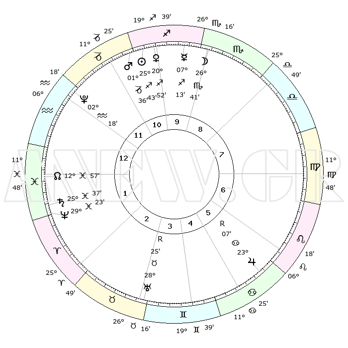 | | ΘΕΣΕΙΣ ΠΛΑΝΗΤΩΝ ΑΣΤΡΟΛΟΓΙΚΟΥ ΧΑΡΤΗ ΤΗΣ ΣΤΙΓΜΗΣ ΑΥΤΗΣ | | | | Πλανήτης | Ζώδιο | Μοίρες | Δεκαήμ. | Σε οίκο | Απόκλιση | | Ακμές των οίκων | | Ηλιος | Τοξότης | 25°38' | Τρίτο | 11 | 23 S 22 | | 1ος | 02°11' | Υδροχόος | | Σελήνη | Σκορπιός | 25°45' | Τρίτο | 10 | 23 S 50 | | 2ος | 16°38' | Ιχθείς | | Ερμής | Τοξότης | 07°07' | Πρώτο | 10 | 20 S 16 | | 3ος | 24°44' | Κριός | | Αφροδίτη | Τοξότης | 20°46' | Τρίτο | 11 | 23 S 02 | | 4ος | 22°49' | Ταύρος | | Αρης | Αιγόκερως | 01°32' | Πρώτο | 11 | 24 S 13 | | 5ος | 15°25' | Δίδυμοι | | Δίας | Καρκίνος | 23°07'R | Τρίτο | 6 | 21 N 39 | | 6ος | 06°56' | Καρκίνος | | Κρόνος | Ιχθείς | 25°36' | Τρίτο | 2 | 03 S 52 | | 7ος | 02°11' | Λέων | | Ουρανός | Ταύρος | 28°25'R | Τρίτο | 4 | 19 N 36 | | 8ος | 16°38' | Παρθένος | | Ποσειδώνας | Ιχθείς | 29°23' | Τρίτο | 2 | 01 S 29 | | 9ος | 24°43' | Ζυγός | | Πλούτωνας | Υδροχόος | 02°18' | Πρώτο | 1 | 23 S 19 | | 10ος | 22°49' | Σκορπιός | | Β. Δεσμός | Ιχθείς | 12°57' | Δεύτερο | 1 | 06 S 42 | | 11ος | 15°25' | Τοξότης | | Ωροσκόπος | Υδροχόος | 02°11' | Πρώτο | | | 12ος | 06°56' | Αιγόκερως | | Μεσουράνημα | Σκορπιός | 22°49' | Τρίτο | | | |