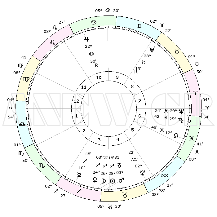 | | ΘΕΣΕΙΣ ΠΛΑΝΗΤΩΝ ΑΣΤΡΟΛΟΓΙΚΟΥ ΧΑΡΤΗ ΤΗΣ ΣΤΙΓΜΗΣ ΑΥΤΗΣ | | | | Πλανήτης | Ζώδιο | Μοίρες | Δεκαήμ. | Σε οίκο | Απόκλιση | | Ακμές των οίκων | | Ηλιος | Τοξότης | 28°14' | Τρίτο | 4 | 23 S 25 | | 1ος | 16°04' | Παρθένος | | Σελήνη | Τοξότης | 26°13' | Τρίτο | 4 | 28 S 14 | | 2ος | 11°31' | Ζυγός | | Ερμής | Τοξότης | 10°42' | Δεύτερο | 3 | 21 S 09 | | 3ος | 11°20' | Σκορπιός | | Αφροδίτη | Τοξότης | 23°59' | Τρίτο | 4 | 23 S 20 | | 4ος | 14°16' | Τοξότης | | Αρης | Αιγόκερως | 03°28' | Πρώτο | 4 | 24 S 12 | | 5ος | 17°35' | Αιγόκερως | | Δίας | Καρκίνος | 22°50'R | Τρίτο | 11 | 21 N 42 | | 6ος | 18°35' | Υδροχόος | | Κρόνος | Ιχθείς | 25°42' | Τρίτο | 7 | 03 S 49 | | 7ος | 16°04' | Ιχθείς | | Ουρανός | Ταύρος | 28°19'R | Τρίτο | 9 | 19 N 35 | | 8ος | 11°31' | Κριός | | Ποσειδώνας | Ιχθείς | 29°24' | Τρίτο | 7 | 01 S 28 | | 9ος | 11°20' | Ταύρος | | Πλούτωνας | Υδροχόος | 02°22' | Πρώτο | 5 | 23 S 18 | | 10ος | 14°16' | Δίδυμοι | | Β. Δεσμός | Ιχθείς | 12°49' | Δεύτερο | 6 | 06 S 45 | | 11ος | 17°35' | Καρκίνος | | Ωροσκόπος | Παρθένος | 16°04' | Δεύτερο | | | 12ος | 18°35' | Λέων | | Μεσουράνημα | Δίδυμοι | 14°16' | Δεύτερο | | | |