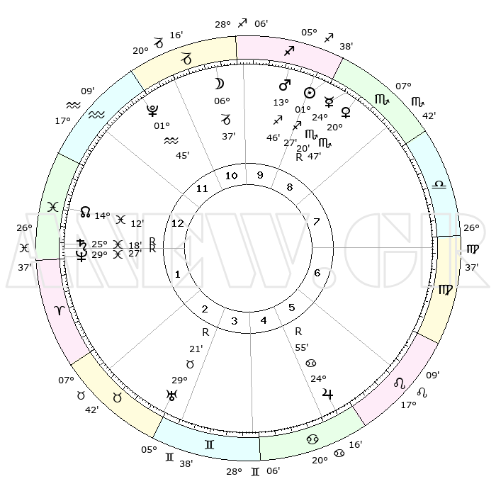 | | ΘΕΣΕΙΣ ΠΛΑΝΗΤΩΝ ΑΣΤΡΟΛΟΓΙΚΟΥ ΧΑΡΤΗ ΤΗΣ ΣΤΙΓΜΗΣ ΑΥΤΗΣ | | | | Πλανήτης | Ζώδιο | Μοίρες | Δεκαήμ. | Σε οίκο | Απόκλιση | | Ακμές των οίκων | | Ηλιος | Τοξότης | 01°22' | Πρώτο | 9 | 20 S 26 | | 1ος | 13°48' | Υδροχόος | | Σελήνη | Αιγόκερως | 05°40' | Πρώτο | 11 | 27 S 59 | | 2ος | 29°26' | Ιχθείς | | Ερμής | Σκορπιός | 24°25'R | Τρίτο | 9 | 17 S 26 | | 3ος | 05°24' | Ταύρος | | Αφροδίτη | Σκορπιός | 20°41' | Τρίτο | 9 | 16 S 59 | | 4ος | 01°42' | Δίδυμοι | | Αρης | Τοξότης | 13°43' | Δεύτερο | 10 | 23 S 02 | | 5ος | 23°43' | Δίδυμοι | | Δίας | Καρκίνος | 24°55'R | Τρίτο | 6 | 21 N 17 | | 6ος | 15°52' | Καρκίνος | | Κρόνος | Ιχθείς | 25°18'R | Τρίτο | 1 | 04 S 04 | | 7ος | 13°48' | Λέων | | Ουρανός | Ταύρος | 29°22'R | Τρίτο | 3 | 19 N 48 | | 8ος | 29°26' | Παρθένος | | Ποσειδώνας | Ιχθείς | 29°27'R | Τρίτο | 2 | 01 S 28 | | 9ος | 05°24' | Σκορπιός | | Πλούτωνας | Υδροχόος | 01°45' | Πρώτο | 12 | 23 S 26 | | 10ος | 01°42' | Τοξότης | | Β. Δεσμός | Ιχθείς | 14°13' | Δεύτερο | 1 | 06 S 13 | | 11ος | 23°43' | Τοξότης | | Ωροσκόπος | Υδροχόος | 13°48' | Δεύτερο | | | 12ος | 15°52' | Αιγόκερως | | Μεσουράνημα | Τοξότης | 01°42' | Πρώτο | | | |