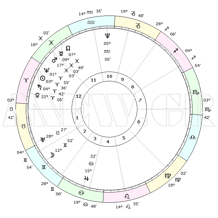 | | ΘΕΣΕΙΣ ΠΛΑΝΗΤΩΝ ΑΣΤΡΟΛΟΓΙΚΟΥ ΧΑΡΤΗ ΤΗΣ ΣΤΙΓΜΗΣ ΑΥΤΗΣ | | | | Πλανήτης | Ζώδιο | Μοίρες | Δεκαήμ. | Σε οίκο | Απόκλιση | | Ακμές των οίκων | | Ηλιος | Κριός | 03°32' | Πρώτο | 1 | 01 N 24 | | 1ος | 27°20' | Ιχθείς | | Σελήνη | Δίδυμοι | 11°57' | Δεύτερο | 3 | 27 N 23 | | 2ος | 08°15' | Ταύρος | | Ερμής | Ιχθείς | 09°02' | Πρώτο | 12 | 08 S 00 | | 3ος | 06°04' | Δίδυμοι | | Αφροδίτη | Κριός | 21°60' | Τρίτο | 1 | 07 N 52 | | 4ος | 28°30' | Δίδυμοι | | Αρης | Ιχθείς | 16°60' | Δεύτερο | 12 | 06 S 07 | | 5ος | 20°42' | Καρκίνος | | Δίας | Καρκίνος | 15°22' | Δεύτερο | 4 | 22 N 55 | | 6ος | 17°42' | Λέων | | Κρόνος | Κριός | 04°41' | Πρώτο | 1 | 00 S 05 | | 7ος | 27°20' | Παρθένος | | Ουρανός | Ταύρος | 28°26' | Τρίτο | 2 | 19 N 38 | | 8ος | 08°15' | Σκορπιός | | Ποσειδώνας | Κριός | 01°55' | Πρώτο | 1 | 00 S 26 | | 9ος | 06°04' | Τοξότης | | Πλούτωνας | Υδροχόος | 05°05' | Πρώτο | 11 | 22 S 48 | | 10ος | 28°30' | Τοξότης | | Β. Δεσμός | Ιχθείς | 07°49' | Πρώτο | 12 | 08 S 38 | | 11ος | 20°42' | Αιγόκερως | | Ωροσκόπος | Ιχθείς | 27°20' | Τρίτο | | | 12ος | 17°42' | Υδροχόος | | Μεσουράνημα | Τοξότης | 28°30' | Τρίτο | | | |