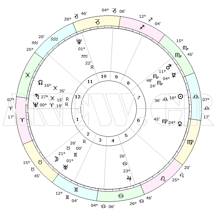 | ΘΕΣΕΙΣ ΠΛΑΝΗΤΩΝ ΑΣΤΡΟΛΟΓΙΚΟΥ ΧΑΡΤΗ ΤΗΣ ΣΤΙΓΜΗΣ ΑΥΤΗΣ | | Πλανήτης | Ζώδιο | Μοίρες | Δεκαήμ. | Σε οίκο | Απόκλιση | | Ακμές των οίκων | Ηλιος | Ζυγός | 16°27' | Δεύτερο | 9 | 06 S 28 | | 1ος | 20°23' | Αιγόκερως | Σελήνη | Ταύρος | 19°11' | Δεύτερο | 4 | 21 N 54 | | 2ος | 02°37' | Ιχθείς | Ερμής | Σκορπιός | 04°11' | Πρώτο | 9 | 13 S 57 | | 3ος | 12°18' | Κριός | Αφροδίτη | Παρθένος | 24°34' | Τρίτο | 8 | 03 N 29 | | 4ος | 12°31' | Ταύρος | Αρης | Σκορπιός | 11°42' | Δεύτερο | 9 | 15 S 30 | | 5ος | 06°07' | Δίδυμοι | Δίας | Καρκίνος | 23°25' | Τρίτο | 7 | 21 N 26 | | 6ος | 27°20' | Δίδυμοι | Κρόνος | Ιχθείς | 27°16'R | Τρίτο | 2 | 03 S 23 | | 7ος | 20°23' | Καρκίνος | Ουρανός | Δίδυμοι | 01°00'R | Πρώτο | 4 | 20 N 09 | | 8ος | 02°37' | Παρθένος | Ποσειδώνας | Κριός | 00°19'R | Πρώτο | 2 | 01 S 08 | | 9ος | 12°18' | Ζυγός | Πλούτωνας | Υδροχόος | 01°22'R | Πρώτο | 1 | 23 S 32 | | 10ος | 12°31' | Σκορπιός | Β. Δεσμός | Ιχθείς | 16°35' | Δεύτερο | 2 | 05 S 17 | | 11ος | 06°07' | Τοξότης | Ωροσκόπος | Αιγόκερως | 20°23' | Τρίτο | | | 12ος | 27°20' | Τοξότης | Μεσουράνημα | Σκορπιός | 12°31' | Δεύτερο | | | |