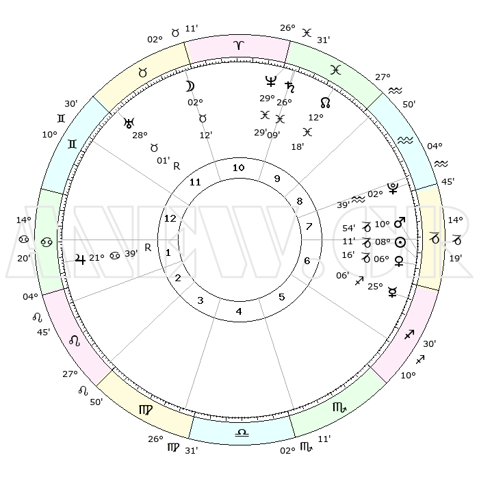 | | ΘΕΣΕΙΣ ΠΛΑΝΗΤΩΝ ΑΣΤΡΟΛΟΓΙΚΟΥ ΧΑΡΤΗ ΤΗΣ ΣΤΙΓΜΗΣ ΑΥΤΗΣ | | | | Πλανήτης | Ζώδιο | Μοίρες | Δεκαήμ. | Σε οίκο | Απόκλιση | | Ακμές των οίκων | | Ηλιος | Αιγόκερως | 08°06' | Πρώτο | 7 | 23 S 11 | | 1ος | 21°57' | Δίδυμοι | | Σελήνη | Ταύρος | 01°13' | Πρώτο | 11 | 15 N 32 | | 2ος | 13°24' | Καρκίνος | | Ερμής | Τοξότης | 24°60' | Τρίτο | 7 | 23 S 38 | | 3ος | 04°47' | Λέων | | Αφροδίτη | Αιγόκερως | 06°11' | Πρώτο | 7 | 23 S 42 | | 4ος | 29°54' | Λέων | | Αρης | Αιγόκερως | 10°51' | Δεύτερο | 7 | 23 S 52 | | 5ος | 02°26' | Ζυγός | | Δίας | Καρκίνος | 21°40'R | Τρίτο | 2 | 21 N 55 | | 6ος | 12°45' | Σκορπιός | | Κρόνος | Ιχθείς | 26°09' | Τρίτο | 10 | 03 S 37 | | 7ος | 21°57' | Τοξότης | | Ουρανός | Ταύρος | 28°01'R | Τρίτο | 12 | 19 N 31 | | 8ος | 13°24' | Αιγόκερως | | Ποσειδώνας | Ιχθείς | 29°29' | Τρίτο | 10 | 01 S 26 | | 9ος | 04°47' | Υδροχόος | | Πλούτωνας | Υδροχόος | 02°39' | Πρώτο | 8 | 23 S 14 | | 10ος | 29°54' | Υδροχόος | | Β. Δεσμός | Ιχθείς | 12°18' | Δεύτερο | 10 | 06 S 57 | | 11ος | 02°26' | Κριός | | Ωροσκόπος | Δίδυμοι | 21°57' | Τρίτο | | | 12ος | 12°45' | Ταύρος | | Μεσουράνημα | Υδροχόος | 29°54' | Τρίτο | | | |
