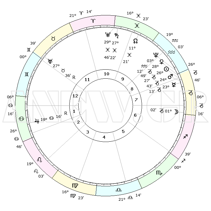 | | ΘΕΣΕΙΣ ΠΛΑΝΗΤΩΝ ΑΣΤΡΟΛΟΓΙΚΟΥ ΧΑΡΤΗ ΤΗΣ ΣΤΙΓΜΗΣ ΑΥΤΗΣ | | | | Πλανήτης | Ζώδιο | Μοίρες | Δεκαήμ. | Σε οίκο | Απόκλιση | | Ακμές των οίκων | | Ηλιος | Αιγόκερως | 26°21' | Τρίτο | 9 | 20 S 53 | | 1ος | 05°26' | Δίδυμοι | | Σελήνη | Τοξότης | 29°59' | Τρίτο | 8 | 28 S 15 | | 2ος | 29°12' | Δίδυμοι | | Ερμής | Αιγόκερως | 23°04' | Τρίτο | 9 | 23 S 18 | | 3ος | 20°28' | Καρκίνος | | Αφροδίτη | Αιγόκερως | 28°42' | Τρίτο | 9 | 21 S 25 | | 4ος | 13°40' | Λέων | | Αρης | Αιγόκερως | 24°39' | Τρίτο | 9 | 22 S 09 | | 5ος | 13°06' | Παρθένος | | Δίας | Καρκίνος | 19°17'R | Δεύτερο | 2 | 22 N 19 | | 6ος | 22°19' | Ζυγός | | Κρόνος | Ιχθείς | 27°22' | Τρίτο | 11 | 03 S 05 | | 7ος | 05°26' | Τοξότης | | Ουρανός | Ταύρος | 27°36'R | Τρίτο | 12 | 19 N 26 | | 8ος | 29°12' | Τοξότης | | Ποσειδώνας | Ιχθείς | 29°46' | Τρίτο | 11 | 01 S 18 | | 9ος | 20°28' | Αιγόκερως | | Πλούτωνας | Υδροχόος | 03°12' | Πρώτο | 9 | 23 S 07 | | 10ος | 13°40' | Υδροχόος | | Β. Δεσμός | Ιχθείς | 11°21' | Δεύτερο | 10 | 07 S 18 | | 11ος | 13°06' | Ιχθείς | | Ωροσκόπος | Δίδυμοι | 05°26' | Πρώτο | | | 12ος | 22°19' | Κριός | | Μεσουράνημα | Υδροχόος | 13°40' | Δεύτερο | | | |