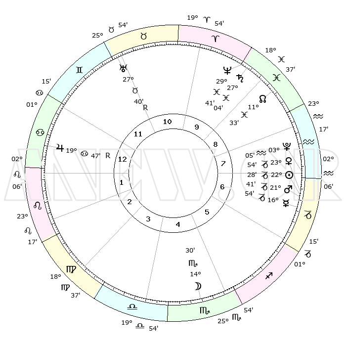 | | ΘΕΣΕΙΣ ΠΛΑΝΗΤΩΝ ΑΣΤΡΟΛΟΓΙΚΟΥ ΧΑΡΤΗ ΤΗΣ ΣΤΙΓΜΗΣ ΑΥΤΗΣ | | | | Πλανήτης | Ζώδιο | Μοίρες | Δεκαήμ. | Σε οίκο | Απόκλιση | | Ακμές των οίκων | | Ηλιος | Αιγόκερως | 22°22' | Τρίτο | 7 | 21 S 35 | | 1ος | 02°31' | Καρκίνος | | Σελήνη | Σκορπιός | 13°21' | Δεύτερο | 5 | 20 S 12 | | 2ος | 23°10' | Καρκίνος | | Ερμής | Αιγόκερως | 16°44' | Δεύτερο | 7 | 24 S 00 | | 3ος | 15°09' | Λέων | | Αφροδίτη | Αιγόκερως | 23°47' | Τρίτο | 8 | 22 S 14 | | 4ος | 11°52' | Παρθένος | | Αρης | Αιγόκερως | 21°37' | Τρίτο | 7 | 22 S 39 | | 5ος | 16°12' | Ζυγός | | Δίας | Καρκίνος | 19°48'R | Δεύτερο | 1 | 22 N 14 | | 6ος | 25°60' | Σκορπιός | | Κρόνος | Ιχθείς | 27°04' | Τρίτο | 10 | 03 S 13 | | 7ος | 02°31' | Αιγόκερως | | Ουρανός | Ταύρος | 27°40'R | Τρίτο | 12 | 19 N 27 | | 8ος | 23°11' | Αιγόκερως | | Ποσειδώνας | Ιχθείς | 29°41' | Τρίτο | 10 | 01 S 20 | | 9ος | 15°09' | Υδροχόος | | Πλούτωνας | Υδροχόος | 03°05' | Πρώτο | 8 | 23 S 09 | | 10ος | 11°52' | Ιχθείς | | Β. Δεσμός | Ιχθείς | 11°33' | Δεύτερο | 9 | 07 S 14 | | 11ος | 16°12' | Κριός | | Ωροσκόπος | Καρκίνος | 02°31' | Πρώτο | | | 12ος | 25°60' | Ταύρος | | Μεσουράνημα | Ιχθείς | 11°52' | Δεύτερο | | | |