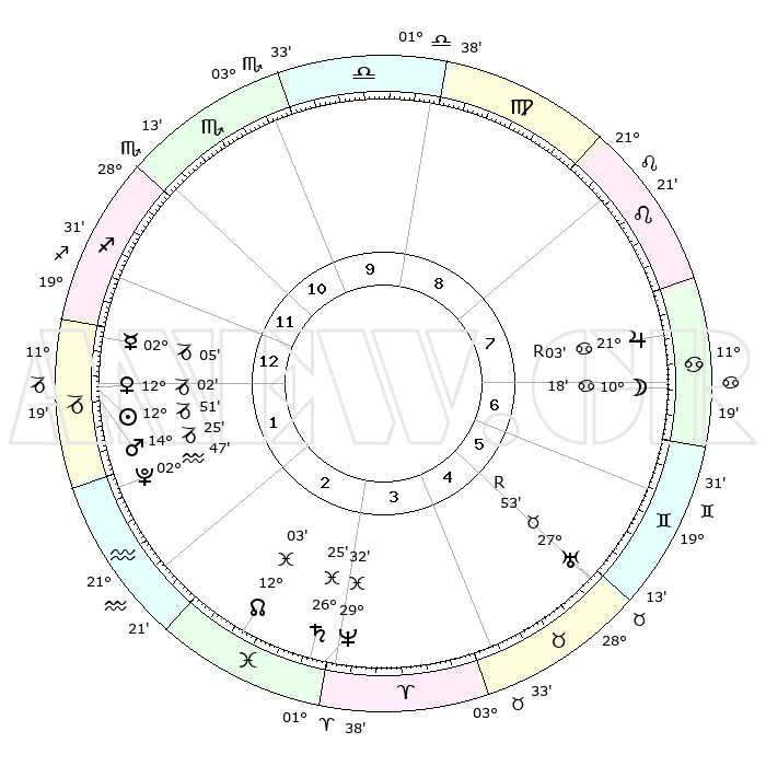 | | ΘΕΣΕΙΣ ΠΛΑΝΗΤΩΝ ΑΣΤΡΟΛΟΓΙΚΟΥ ΧΑΡΤΗ ΤΗΣ ΣΤΙΓΜΗΣ ΑΥΤΗΣ | | | | Πλανήτης | Ζώδιο | Μοίρες | Δεκαήμ. | Σε οίκο | Απόκλιση | | Ακμές των οίκων | | Ηλιος | Αιγόκερως | 12°45' | Δεύτερο | 1 | 22 S 49 | | 1ος | 11°18' | Τοξότης | | Σελήνη | Καρκίνος | 08°55' | Πρώτο | 7 | 27 N 35 | | 2ος | 14°16' | Αιγόκερως | | Ερμής | Αιγόκερως | 01°57' | Πρώτο | 1 | 24 S 13 | | 3ος | 21°52' | Υδροχόος | | Αφροδίτη | Αιγόκερως | 11°55' | Δεύτερο | 1 | 23 S 29 | | 4ος | 27°48' | Ιχθείς | | Αρης | Αιγόκερως | 14°21' | Δεύτερο | 2 | 23 S 34 | | 5ος | 27°13' | Κριός | | Δίας | Καρκίνος | 21°04'R | Τρίτο | 8 | 22 N 01 | | 6ος | 20°48' | Ταύρος | | Κρόνος | Ιχθείς | 26°25' | Τρίτο | 3 | 03 S 30 | | 7ος | 11°18' | Δίδυμοι | | Ουρανός | Ταύρος | 27°53'R | Τρίτο | 6 | 19 N 30 | | 8ος | 14°16' | Καρκίνος | | Ποσειδώνας | Ιχθείς | 29°32' | Τρίτο | 4 | 01 S 24 | | 9ος | 21°52' | Λέων | | Πλούτωνας | Υδροχόος | 02°47' | Πρώτο | 2 | 23 S 12 | | 10ος | 27°48' | Παρθένος | | Β. Δεσμός | Ιχθείς | 12°03' | Δεύτερο | 3 | 07 S 02 | | 11ος | 27°13' | Ζυγός | | Ωροσκόπος | Τοξότης | 11°18' | Δεύτερο | | | 12ος | 20°48' | Σκορπιός | | Μεσουράνημα | Παρθένος | 27°48' | Τρίτο | | | |
