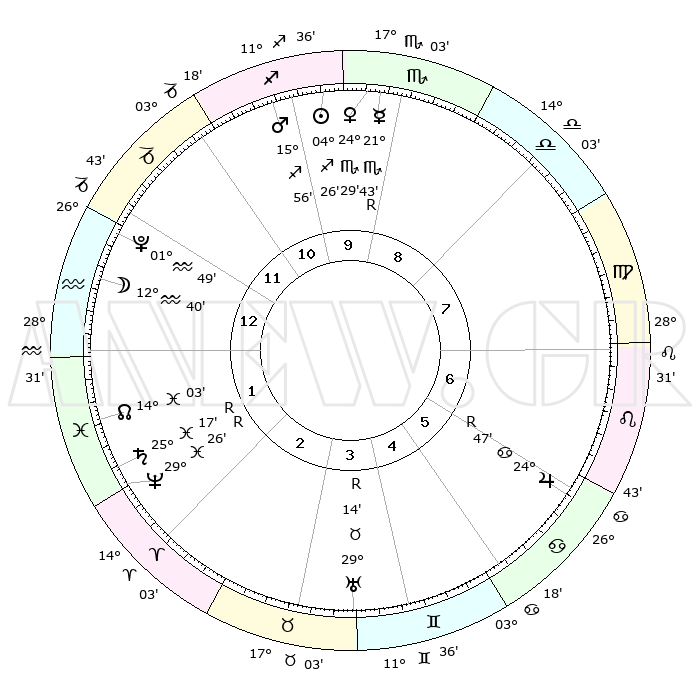 | | ΘΕΣΕΙΣ ΠΛΑΝΗΤΩΝ ΑΣΤΡΟΛΟΓΙΚΟΥ ΧΑΡΤΗ ΤΗΣ ΣΤΙΓΜΗΣ ΑΥΤΗΣ | | | | Πλανήτης | Ζώδιο | Μοίρες | Δεκαήμ. | Σε οίκο | Απόκλιση | | Ακμές των οίκων | | Ηλιος | Τοξότης | 04°25' | Πρώτο | 9 | 21 S 01 | | 1ος | 22°21' | Υδροχόος | | Σελήνη | Υδροχόος | 12°31' | Δεύτερο | 12 | 19 S 36 | | 2ος | 08°08' | Κριός | | Ερμής | Σκορπιός | 21°44'R | Τρίτο | 9 | 16 S 06 | | 3ος | 12°23' | Ταύρος | | Αφροδίτη | Σκορπιός | 24°28' | Τρίτο | 9 | 18 S 03 | | 4ος | 07°36' | Δίδυμοι | | Αρης | Τοξότης | 15°56' | Δεύτερο | 10 | 23 S 19 | | 5ος | 29°23' | Δίδυμοι | | Δίας | Καρκίνος | 24°47'R | Τρίτο | 6 | 21 N 19 | | 6ος | 22°12' | Καρκίνος | | Κρόνος | Ιχθείς | 25°17'R | Τρίτο | 1 | 04 S 04 | | 7ος | 22°21' | Λέων | | Ουρανός | Ταύρος | 29°14'R | Τρίτο | 3 | 19 N 47 | | 8ος | 08°08' | Ζυγός | | Ποσειδώνας | Ιχθείς | 29°26'R | Τρίτο | 1 | 01 S 28 | | 9ος | 12°23' | Σκορπιός | | Πλούτωνας | Υδροχόος | 01°49' | Πρώτο | 12 | 23 S 25 | | 10ος | 07°36' | Τοξότης | | Β. Δεσμός | Ιχθείς | 14°03' | Δεύτερο | 1 | 06 S 16 | | 11ος | 29°23' | Τοξότης | | Ωροσκόπος | Υδροχόος | 22°21' | Τρίτο | | | 12ος | 22°12' | Αιγόκερως | | Μεσουράνημα | Τοξότης | 07°36' | Πρώτο | | | |