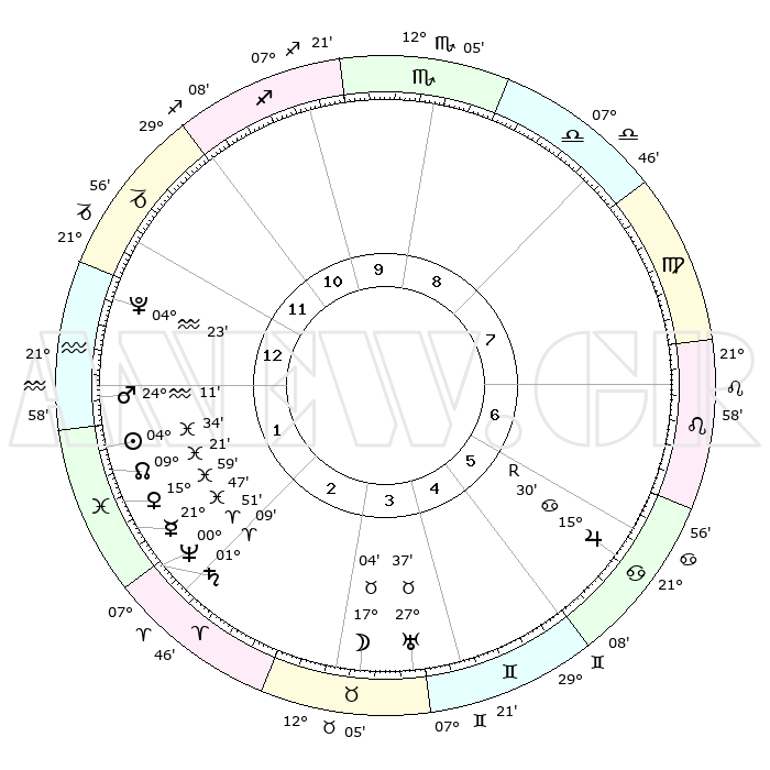 | | ΘΕΣΕΙΣ ΠΛΑΝΗΤΩΝ ΑΣΤΡΟΛΟΓΙΚΟΥ ΧΑΡΤΗ ΤΗΣ ΣΤΙΓΜΗΣ ΑΥΤΗΣ | | | | Πλανήτης | Ζώδιο | Μοίρες | Δεκαήμ. | Σε οίκο | Απόκλιση | | Ακμές των οίκων | | Ηλιος | Ιχθείς | 04°25' | Πρώτο | 2 | 09 S 53 | | 1ος | 24°18' | Τοξότης | | Σελήνη | Ταύρος | 15°01' | Δεύτερο | 5 | 20 N 57 | | 2ος | 00°03' | Υδροχόος | | Ερμής | Ιχθείς | 21°43' | Τρίτο | 3 | 01 S 25 | | 3ος | 09°31' | Ιχθείς | | Αφροδίτη | Ιχθείς | 15°48' | Δεύτερο | 3 | 06 S 55 | | 4ος | 14°18' | Κριός | | Αρης | Υδροχόος | 24°04' | Τρίτο | 2 | 14 S 32 | | 5ος | 11°32' | Ταύρος | | Δίας | Καρκίνος | 15°30'R | Δεύτερο | 7 | 22 N 52 | | 6ος | 03°46' | Δίδυμοι | | Κρόνος | Κριός | 01°08' | Πρώτο | 3 | 01 S 31 | | 7ος | 24°18' | Δίδυμοι | | Ουρανός | Ταύρος | 27°37' | Τρίτο | 5 | 19 N 27 | | 8ος | 00°03' | Λέων | | Ποσειδώνας | Κριός | 00°50' | Πρώτο | 3 | 00 S 52 | | 9ος | 09°31' | Παρθένος | | Πλούτωνας | Υδροχόος | 04°22' | Πρώτο | 2 | 22 S 54 | | 10ος | 14°18' | Ζυγός | | Β. Δεσμός | Ιχθείς | 09°22' | Πρώτο | 2 | 08 S 03 | | 11ος | 11°32' | Σκορπιός | | Ωροσκόπος | Τοξότης | 24°18' | Τρίτο | | | 12ος | 03°46' | Τοξότης | | Μεσουράνημα | Ζυγός | 14°18' | Δεύτερο | | | |