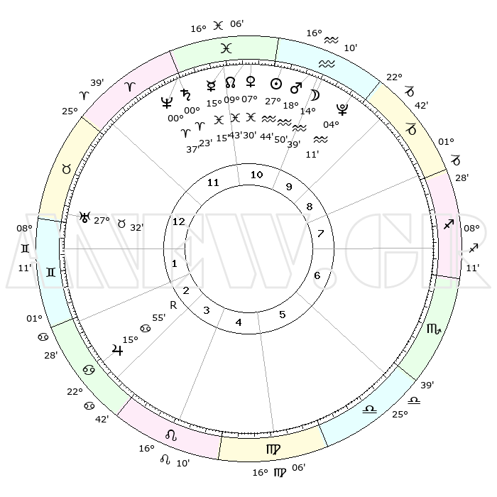 | | ΘΕΣΕΙΣ ΠΛΑΝΗΤΩΝ ΑΣΤΡΟΛΟΓΙΚΟΥ ΧΑΡΤΗ ΤΗΣ ΣΤΙΓΜΗΣ ΑΥΤΗΣ | | | | Πλανήτης | Ζώδιο | Μοίρες | Δεκαήμ. | Σε οίκο | Απόκλιση | | Ακμές των οίκων | | Ηλιος | Υδροχόος | 27°41' | Τρίτο | 11 | 12 S 17 | | 1ος | 12°43' | Ταύρος | | Σελήνη | Υδροχόος | 13°55' | Δεύτερο | 10 | 18 S 47 | | 2ος | 11°31' | Δίδυμοι | | Ερμής | Ιχθείς | 15°11' | Δεύτερο | 11 | 05 S 31 | | 3ος | 03°56' | Καρκίνος | | Αφροδίτη | Ιχθείς | 07°26' | Πρώτο | 11 | 10 S 08 | | 4ος | 25°50' | Καρκίνος | | Αρης | Υδροχόος | 18°48' | Δεύτερο | 10 | 16 S 13 | | 5ος | 21°40' | Λέων | | Δίας | Καρκίνος | 15°55'R | Δεύτερο | 3 | 22 N 49 | | 6ος | 26°56' | Παρθένος | | Κρόνος | Κριός | 00°23' | Πρώτο | 12 | 01 S 49 | | 7ος | 12°43' | Σκορπιός | | Ουρανός | Ταύρος | 27°31' | Τρίτο | 1 | 19 N 25 | | 8ος | 11°31' | Τοξότης | | Ποσειδώνας | Κριός | 00°37' | Πρώτο | 12 | 00 S 58 | | 9ος | 03°56' | Αιγόκερως | | Πλούτωνας | Υδροχόος | 04°11' | Πρώτο | 10 | 22 S 56 | | 10ος | 25°50' | Αιγόκερως | | Β. Δεσμός | Ιχθείς | 09°43' | Πρώτο | 11 | 07 S 56 | | 11ος | 21°40' | Υδροχόος | | Ωροσκόπος | Ταύρος | 12°43' | Δεύτερο | | | 12ος | 26°56' | Ιχθείς | | Μεσουράνημα | Αιγόκερως | 25°50' | Τρίτο | | | |