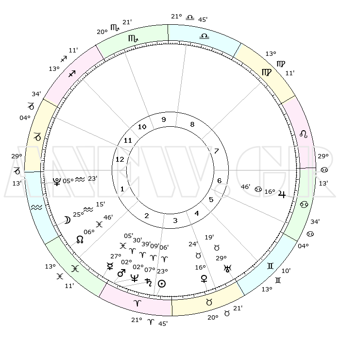 | | ΘΕΣΕΙΣ ΠΛΑΝΗΤΩΝ ΑΣΤΡΟΛΟΓΙΚΟΥ ΧΑΡΤΗ ΤΗΣ ΣΤΙΓΜΗΣ ΑΥΤΗΣ | | | | Πλανήτης | Ζώδιο | Μοίρες | Δεκαήμ. | Σε οίκο | Απόκλιση | | Ακμές των οίκων | | Ηλιος | Κριός | 23°01' | Τρίτο | 3 | 08 N 57 | | 1ος | 01°43' | Αιγόκερως | | Σελήνη | Υδροχόος | 24°18' | Τρίτο | 2 | 14 S 35 | | 2ος | 09°18' | Υδροχόος | | Ερμής | Ιχθείς | 26°59' | Τρίτο | 3 | 03 S 30 | | 3ος | 19°25' | Ιχθείς | | Αφροδίτη | Ταύρος | 16°18' | Δεύτερο | 4 | 16 N 47 | | 4ος | 23°04' | Κριός | | Αρης | Κριός | 02°26' | Πρώτο | 3 | 00 N 03 | | 5ος | 19°07' | Ταύρος | | Δίας | Καρκίνος | 16°45' | Δεύτερο | 7 | 22 N 45 | | 6ος | 10°49' | Δίδυμοι | | Κρόνος | Κριός | 07°08' | Πρώτο | 3 | 00 N 52 | | 7ος | 01°43' | Καρκίνος | | Ουρανός | Ταύρος | 29°19' | Τρίτο | 5 | 19 N 50 | | 8ος | 09°18' | Λέων | | Ποσειδώνας | Κριός | 02°39' | Πρώτο | 3 | 00 S 09 | | 9ος | 19°25' | Παρθένος | | Πλούτωνας | Υδροχόος | 05°23' | Πρώτο | 1 | 22 S 47 | | 10ος | 23°04' | Ζυγός | | Β. Δεσμός | Ιχθείς | 06°46' | Πρώτο | 2 | 09 S 01 | | 11ος | 19°07' | Σκορπιός | | Ωροσκόπος | Αιγόκερως | 01°43' | Πρώτο | | | 12ος | 10°49' | Τοξότης | | Μεσουράνημα | Ζυγός | 23°04' | Τρίτο | | | |