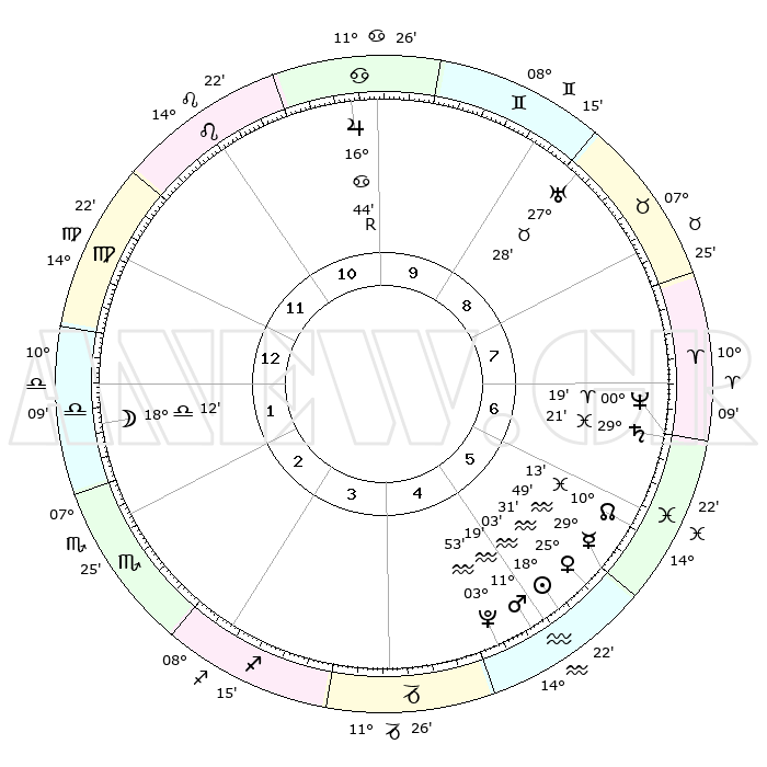 | | ΘΕΣΕΙΣ ΠΛΑΝΗΤΩΝ ΑΣΤΡΟΛΟΓΙΚΟΥ ΧΑΡΤΗ ΤΗΣ ΣΤΙΓΜΗΣ ΑΥΤΗΣ | | | | Πλανήτης | Ζώδιο | Μοίρες | Δεκαήμ. | Σε οίκο | Απόκλιση | | Ακμές των οίκων | | Ηλιος | Υδροχόος | 17°59' | Δεύτερο | 5 | 15 S 26 | | 1ος | 19°53' | Παρθένος | | Σελήνη | Ζυγός | 17°21' | Δεύτερο | 2 | 09 S 49 | | 2ος | 15°40' | Ζυγός | | Ερμής | Υδροχόος | 29°42' | Τρίτο | 6 | 12 S 51 | | 3ος | 15°41' | Σκορπιός | | Αφροδίτη | Υδροχόος | 25°26' | Τρίτο | 6 | 14 S 23 | | 4ος | 18°36' | Τοξότης | | Αρης | Υδροχόος | 11°16' | Δεύτερο | 5 | 18 S 25 | | 5ος | 21°48' | Αιγόκερως | | Δίας | Καρκίνος | 16°45'R | Δεύτερο | 10 | 22 N 42 | | 6ος | 22°37' | Υδροχόος | | Κρόνος | Ιχθείς | 29°20' | Τρίτο | 7 | 02 S 15 | | 7ος | 19°53' | Ιχθείς | | Ουρανός | Ταύρος | 27°28' | Τρίτο | 9 | 19 N 24 | | 8ος | 15°40' | Κριός | | Ποσειδώνας | Κριός | 00°19' | Πρώτο | 7 | 01 S 05 | | 9ος | 15°41' | Ταύρος | | Πλούτωνας | Υδροχόος | 03°53' | Πρώτο | 5 | 22 S 59 | | 10ος | 18°36' | Δίδυμοι | | Β. Δεσμός | Ιχθείς | 10°13' | Δεύτερο | 6 | 07 S 44 | | 11ος | 21°48' | Καρκίνος | | Ωροσκόπος | Παρθένος | 19°53' | Δεύτερο | | | 12ος | 22°37' | Λέων | | Μεσουράνημα | Δίδυμοι | 18°36' | Δεύτερο | | | |