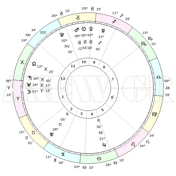 | | ΘΕΣΕΙΣ ΠΛΑΝΗΤΩΝ ΑΣΤΡΟΛΟΓΙΚΟΥ ΧΑΡΤΗ ΤΗΣ ΣΤΙΓΜΗΣ ΑΥΤΗΣ | | | | Πλανήτης | Ζώδιο | Μοίρες | Δεκαήμ. | Σε οίκο | Απόκλιση | | Ακμές των οίκων | | Ηλιος | Αιγόκερως | 05°50' | Πρώτο | 11 | 23 S 18 | | 1ος | 26°38' | Υδροχόος | | Σελήνη | Κριός | 00°19' | Πρώτο | 1 | 01 N 39 | | 2ος | 12°17' | Κριός | | Ερμής | Τοξότης | 21°39' | Τρίτο | 10 | 23 S 12 | | 3ος | 15°40' | Ταύρος | | Αφροδίτη | Αιγόκερως | 03°23' | Πρώτο | 11 | 23 S 43 | | 4ος | 10°24' | Δίδυμοι | | Αρης | Αιγόκερως | 09°09' | Πρώτο | 11 | 23 S 59 | | 5ος | 02°07' | Καρκίνος | | Δίας | Καρκίνος | 21°57'R | Τρίτο | 5 | 21 N 52 | | 6ος | 25°21' | Καρκίνος | | Κρόνος | Ιχθείς | 26°02' | Τρίτο | 1 | 03 S 40 | | 7ος | 26°38' | Λέων | | Ουρανός | Ταύρος | 28°05'R | Τρίτο | 3 | 19 N 32 | | 8ος | 12°17' | Ζυγός | | Ποσειδώνας | Ιχθείς | 29°27' | Τρίτο | 1 | 01 S 27 | | 9ος | 15°40' | Σκορπιός | | Πλούτωνας | Υδροχόος | 02°35' | Πρώτο | 12 | 23 S 15 | | 10ος | 10°24' | Τοξότης | | Β. Δεσμός | Ιχθείς | 12°25' | Δεύτερο | 1 | 06 S 54 | | 11ος | 02°07' | Αιγόκερως | | Ωροσκόπος | Υδροχόος | 26°38' | Τρίτο | | | 12ος | 25°21' | Αιγόκερως | | Μεσουράνημα | Τοξότης | 10°24' | Δεύτερο | | | |