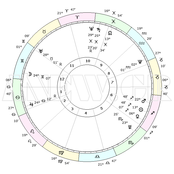 | | ΘΕΣΕΙΣ ΠΛΑΝΗΤΩΝ ΑΣΤΡΟΛΟΓΙΚΟΥ ΧΑΡΤΗ ΤΗΣ ΣΤΙΓΜΗΣ ΑΥΤΗΣ | | | | Πλανήτης | Ζώδιο | Μοίρες | Δεκαήμ. | Σε οίκο | Απόκλιση | | Ακμές των οίκων | | Ηλιος | Τοξότης | 13°46' | Δεύτερο | 6 | 22 S 27 | | 1ος | 25°57' | Δίδυμοι | | Σελήνη | Δίδυμοι | 23°37' | Τρίτο | 12 | 28 N 12 | | 2ος | 17°02' | Καρκίνος | | Ερμής | Σκορπιός | 23°23' | Τρίτο | 6 | 16 S 12 | | 3ος | 08°36' | Λέων | | Αφροδίτη | Τοξότης | 06°04' | Πρώτο | 6 | 20 S 48 | | 4ος | 04°17' | Παρθένος | | Αρης | Τοξότης | 22°46' | Τρίτο | 6 | 23 S 56 | | 5ος | 07°33' | Ζυγός | | Δίας | Καρκίνος | 24°12'R | Τρίτο | 2 | 21 N 26 | | 6ος | 17°46' | Σκορπιός | | Κρόνος | Ιχθείς | 25°20' | Τρίτο | 10 | 04 S 01 | | 7ος | 25°57' | Τοξότης | | Ουρανός | Ταύρος | 28°51'R | Τρίτο | 12 | 19 N 42 | | 8ος | 17°02' | Αιγόκερως | | Ποσειδώνας | Ιχθείς | 29°23'R | Τρίτο | 10 | 01 S 29 | | 9ος | 08°36' | Υδροχόος | | Πλούτωνας | Υδροχόος | 02°01' | Πρώτο | 8 | 23 S 23 | | 10ος | 04°17' | Ιχθείς | | Β. Δεσμός | Ιχθείς | 13°34' | Δεύτερο | 10 | 06 S 28 | | 11ος | 07°33' | Κριός | | Ωροσκόπος | Δίδυμοι | 25°57' | Τρίτο | | | 12ος | 17°46' | Ταύρος | | Μεσουράνημα | Ιχθείς | 04°17' | Πρώτο | | | |