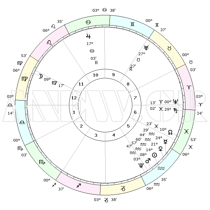 | | ΘΕΣΕΙΣ ΠΛΑΝΗΤΩΝ ΑΣΤΡΟΛΟΓΙΚΟΥ ΧΑΡΤΗ ΤΗΣ ΣΤΙΓΜΗΣ ΑΥΤΗΣ | | | | Πλανήτης | Ζώδιο | Μοίρες | Δεκαήμ. | Σε οίκο | Απόκλιση | | Ακμές των οίκων | | Ηλιος | Υδροχόος | 14°56' | Δεύτερο | 5 | 16 S 21 | | 1ος | 15°14' | Παρθένος | | Σελήνη | Παρθένος | 08°28' | Πρώτο | 12 | 08 N 27 | | 2ος | 10°36' | Ζυγός | | Ερμής | Υδροχόος | 24°23' | Τρίτο | 6 | 14 S 58 | | 3ος | 10°22' | Σκορπιός | | Αφροδίτη | Υδροχόος | 21°39' | Τρίτο | 6 | 15 S 36 | | 4ος | 13°18' | Τοξότης | | Αρης | Υδροχόος | 08°54' | Πρώτο | 5 | 19 S 03 | | 5ος | 16°39' | Αιγόκερως | | Δίας | Καρκίνος | 17°03'R | Δεύτερο | 11 | 22 N 39 | | 6ος | 17°41' | Υδροχόος | | Κρόνος | Ιχθείς | 29°02' | Τρίτο | 7 | 02 S 23 | | 7ος | 15°14' | Ιχθείς | | Ουρανός | Ταύρος | 27°27'R | Τρίτο | 9 | 19 N 24 | | 8ος | 10°36' | Κριός | | Ποσειδώνας | Κριός | 00°13' | Πρώτο | 7 | 01 S 07 | | 9ος | 10°22' | Ταύρος | | Πλούτωνας | Υδροχόος | 03°47' | Πρώτο | 5 | 23 S 00 | | 10ος | 13°18' | Δίδυμοι | | Β. Δεσμός | Ιχθείς | 10°23' | Δεύτερο | 6 | 07 S 40 | | 11ος | 16°39' | Καρκίνος | | Ωροσκόπος | Παρθένος | 15°14' | Δεύτερο | | | 12ος | 17°41' | Λέων | | Μεσουράνημα | Δίδυμοι | 13°18' | Δεύτερο | | | |
