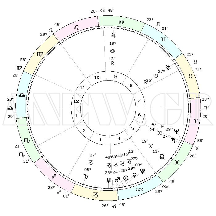 | | ΘΕΣΕΙΣ ΠΛΑΝΗΤΩΝ ΑΣΤΡΟΛΟΓΙΚΟΥ ΧΑΡΤΗ ΤΗΣ ΣΤΙΓΜΗΣ ΑΥΤΗΣ | | | | Πλανήτης | Ζώδιο | Μοίρες | Δεκαήμ. | Σε οίκο | Απόκλιση | | Ακμές των οίκων | | Ηλιος | Αιγόκερως | 26°44' | Τρίτο | 4 | 20 S 48 | | 1ος | 01°02' | Ζυγός | | Σελήνη | Αιγόκερως | 04°32' | Πρώτο | 4 | 28 S 01 | | 2ος | 27°41' | Ζυγός | | Ερμής | Αιγόκερως | 23°41' | Τρίτο | 4 | 23 S 13 | | 3ος | 28°10' | Σκορπιός | | Αφροδίτη | Αιγόκερως | 29°11' | Τρίτο | 4 | 21 S 20 | | 4ος | 01°09' | Αιγόκερως | | Αρης | Αιγόκερως | 24°56' | Τρίτο | 4 | 22 S 06 | | 5ος | 04°07' | Υδροχόος | | Δίας | Καρκίνος | 19°14'R | Δεύτερο | 10 | 22 N 20 | | 6ος | 04°31' | Ιχθείς | | Κρόνος | Ιχθείς | 27°24' | Τρίτο | 6 | 03 S 04 | | 7ος | 01°02' | Κριός | | Ουρανός | Ταύρος | 27°36'R | Τρίτο | 8 | 19 N 26 | | 8ος | 27°41' | Κριός | | Ποσειδώνας | Ιχθείς | 29°46' | Τρίτο | 6 | 01 S 18 | | 9ος | 28°10' | Ταύρος | | Πλούτωνας | Υδροχόος | 03°13' | Πρώτο | 4 | 23 S 07 | | 10ος | 01°09' | Καρκίνος | | Β. Δεσμός | Ιχθείς | 11°20' | Δεύτερο | 6 | 07 S 19 | | 11ος | 04°07' | Λέων | | Ωροσκόπος | Ζυγός | 01°02' | Πρώτο | | | 12ος | 04°31' | Παρθένος | | Μεσουράνημα | Καρκίνος | 01°09' | Πρώτο | | | |
