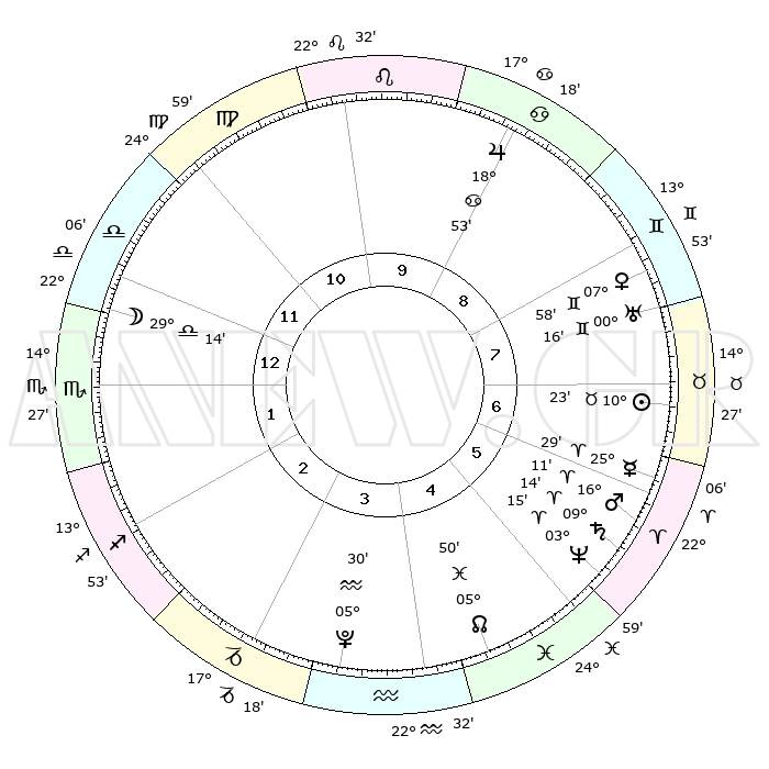 | | ΘΕΣΕΙΣ ΠΛΑΝΗΤΩΝ ΑΣΤΡΟΛΟΓΙΚΟΥ ΧΑΡΤΗ ΤΗΣ ΣΤΙΓΜΗΣ ΑΥΤΗΣ | | | | Πλανήτης | Ζώδιο | Μοίρες | Δεκαήμ. | Σε οίκο | Απόκλιση | | Ακμές των οίκων | | Ηλιος | Ταύρος | 10°21' | Δεύτερο | 7 | 14 N 55 | | 1ος | 00°33' | Σκορπιός | | Σελήνη | Ζυγός | 28°39' | Τρίτο | 12 | 14 S 41 | | 2ος | 29°00' | Σκορπιός | | Ερμής | Κριός | 25°24' | Τρίτο | 6 | 08 N 00 | | 3ος | 01°00' | Αιγόκερως | | Αφροδίτη | Δίδυμοι | 07°55' | Πρώτο | 8 | 22 N 30 | | 4ος | 05°14' | Υδροχόος | | Αρης | Κριός | 16°08' | Δεύτερο | 6 | 05 N 32 | | 5ος | 08°08' | Ιχθείς | | Δίας | Καρκίνος | 18°52' | Δεύτερο | 9 | 22 N 29 | | 6ος | 06°46' | Κριός | | Κρόνος | Κριός | 09°14' | Πρώτο | 6 | 01 N 39 | | 7ος | 00°33' | Ταύρος | | Ουρανός | Δίδυμοι | 00°16' | Πρώτο | 8 | 20 N 02 | | 8ος | 29°00' | Ταύρος | | Ποσειδώνας | Κριός | 03°15' | Πρώτο | 5 | 00 N 05 | | 9ος | 01°00' | Καρκίνος | | Πλούτωνας | Υδροχόος | 05°30' | Πρώτο | 4 | 22 S 49 | | 10ος | 05°14' | Λέων | | Β. Δεσμός | Ιχθείς | 05°50' | Πρώτο | 4 | 09 S 22 | | 11ος | 08°08' | Παρθένος | | Ωροσκόπος | Σκορπιός | 00°33' | Πρώτο | | | 12ος | 06°46' | Ζυγός | | Μεσουράνημα | Λέων | 05°14' | Πρώτο | | | |