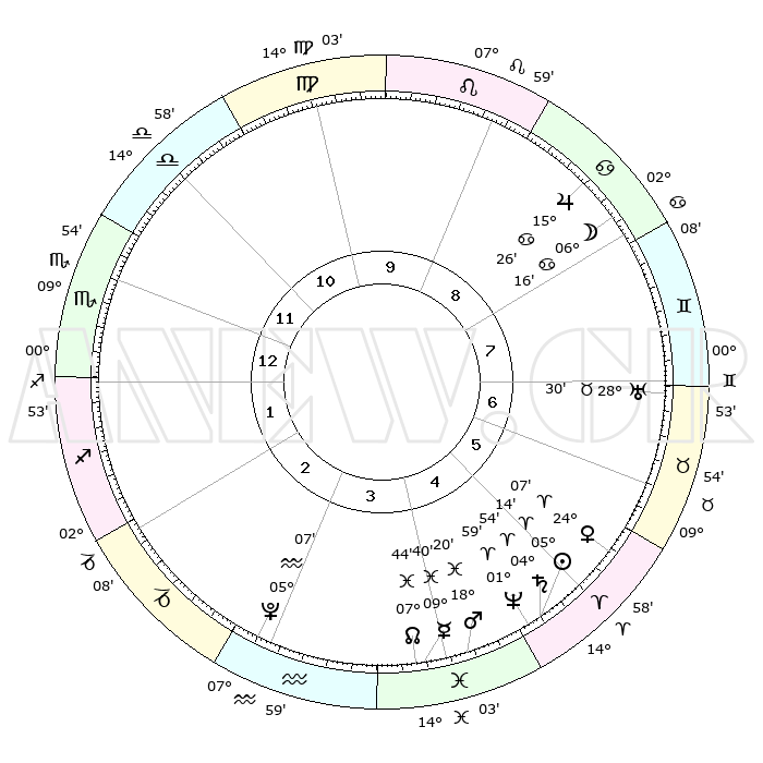 | | ΘΕΣΕΙΣ ΠΛΑΝΗΤΩΝ ΑΣΤΡΟΛΟΓΙΚΟΥ ΧΑΡΤΗ ΤΗΣ ΣΤΙΓΜΗΣ ΑΥΤΗΣ | | | | Πλανήτης | Ζώδιο | Μοίρες | Δεκαήμ. | Σε οίκο | Απόκλιση | | Ακμές των οίκων | | Ηλιος | Κριός | 05°10' | Πρώτο | 5 | 02 N 03 | | 1ος | 11°07' | Σκορπιός | | Σελήνη | Καρκίνος | 05°19' | Πρώτο | 8 | 28 N 00 | | 2ος | 10°17' | Τοξότης | | Ερμής | Ιχθείς | 09°39' | Πρώτο | 4 | 08 S 06 | | 3ος | 13°18' | Αιγόκερως | | Αφροδίτη | Κριός | 24°02' | Τρίτο | 6 | 08 N 41 | | 4ος | 18°18' | Υδροχόος | | Αρης | Ιχθείς | 18°17' | Δεύτερο | 4 | 05 S 37 | | 5ος | 20°55' | Ιχθείς | | Δίας | Καρκίνος | 15°26' | Δεύτερο | 9 | 22 N 54 | | 6ος | 18°26' | Κριός | | Κρόνος | Κριός | 04°53' | Πρώτο | 5 | 00 S 01 | | 7ος | 11°07' | Ταύρος | | Ουρανός | Ταύρος | 28°30' | Τρίτο | 7 | 19 N 39 | | 8ος | 10°17' | Δίδυμοι | | Ποσειδώνας | Κριός | 01°59' | Πρώτο | 5 | 00 S 25 | | 9ος | 13°18' | Καρκίνος | | Πλούτωνας | Υδροχόος | 05°07' | Πρώτο | 3 | 22 S 48 | | 10ος | 18°18' | Λέων | | Β. Δεσμός | Ιχθείς | 07°44' | Πρώτο | 4 | 08 S 40 | | 11ος | 20°55' | Παρθένος | | Ωροσκόπος | Σκορπιός | 11°07' | Δεύτερο | | | 12ος | 18°26' | Ζυγός | | Μεσουράνημα | Λέων | 18°18' | Δεύτερο | | | |