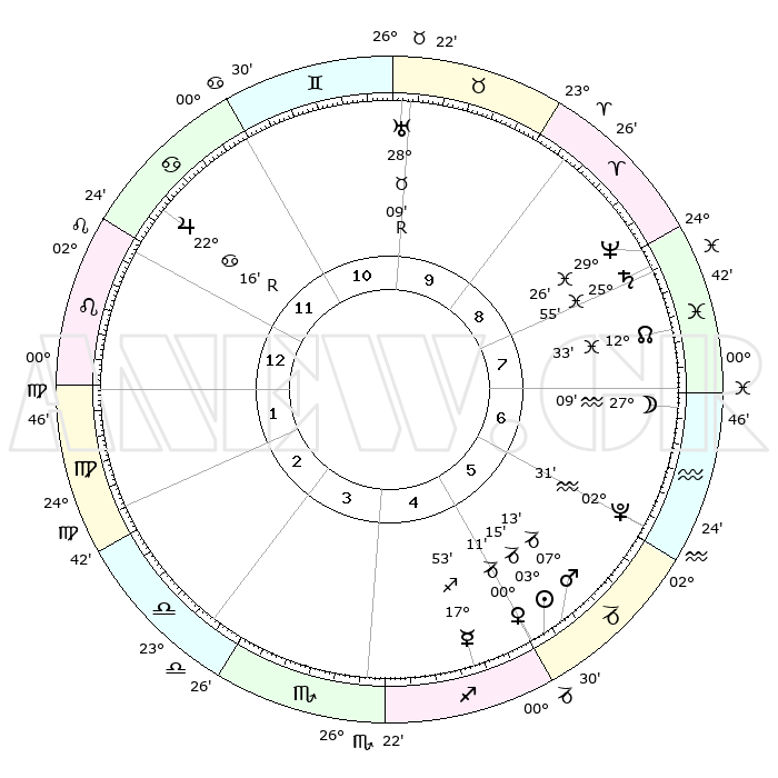 | | ΘΕΣΕΙΣ ΠΛΑΝΗΤΩΝ ΑΣΤΡΟΛΟΓΙΚΟΥ ΧΑΡΤΗ ΤΗΣ ΣΤΙΓΜΗΣ ΑΥΤΗΣ | | | | Πλανήτης | Ζώδιο | Μοίρες | Δεκαήμ. | Σε οίκο | Απόκλιση | | Ακμές των οίκων | | Ηλιος | Αιγόκερως | 03°11' | Πρώτο | 5 | 23 S 24 | | 1ος | 07°49' | Λέων | | Σελήνη | Υδροχόος | 26°09' | Τρίτο | 7 | 14 S 03 | | 2ος | 29°27' | Λέων | | Ερμής | Τοξότης | 17°46' | Δεύτερο | 5 | 22 S 35 | | 3ος | 25°34' | Παρθένος | | Αφροδίτη | Αιγόκερως | 00°05' | Πρώτο | 5 | 23 S 40 | | 4ος | 27°26' | Ζυγός | | Αρης | Αιγόκερως | 07°09' | Πρώτο | 5 | 24 S 05 | | 5ος | 03°10' | Τοξότης | | Δίας | Καρκίνος | 22°16'R | Τρίτο | 12 | 21 N 49 | | 6ος | 07°39' | Αιγόκερως | | Κρόνος | Ιχθείς | 25°54' | Τρίτο | 9 | 03 S 43 | | 7ος | 07°49' | Υδροχόος | | Ουρανός | Ταύρος | 28°10'R | Τρίτο | 10 | 19 N 33 | | 8ος | 29°27' | Υδροχόος | | Ποσειδώνας | Ιχθείς | 29°26' | Τρίτο | 9 | 01 S 27 | | 9ος | 25°34' | Ιχθείς | | Πλούτωνας | Υδροχόος | 02°31' | Πρώτο | 6 | 23 S 16 | | 10ος | 27°26' | Κριός | | Β. Δεσμός | Ιχθείς | 12°33' | Δεύτερο | 8 | 06 S 51 | | 11ος | 03°10' | Δίδυμοι | | Ωροσκόπος | Λέων | 07°49' | Πρώτο | | | 12ος | 07°39' | Καρκίνος | | Μεσουράνημα | Κριός | 27°26' | Τρίτο | | | |