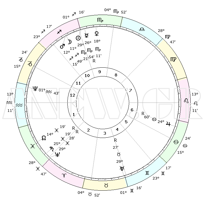 | | ΘΕΣΕΙΣ ΠΛΑΝΗΤΩΝ ΑΣΤΡΟΛΟΓΙΚΟΥ ΧΑΡΤΗ ΤΗΣ ΣΤΙΓΜΗΣ ΑΥΤΗΣ | | | | Πλανήτης | Ζώδιο | Μοίρες | Δεκαήμ. | Σε οίκο | Απόκλιση | | Ακμές των οίκων | | Ηλιος | Σκορπιός | 29°19' | Τρίτο | 10 | 20 S 00 | | 1ος | 25°58' | Αιγόκερως | | Σελήνη | Τοξότης | 11°21' | Δεύτερο | 11 | 27 S 05 | | 2ος | 09°21' | Ιχθείς | | Ερμής | Σκορπιός | 26°57'R | Τρίτο | 10 | 18 S 37 | | 3ος | 18°23' | Κριός | | Αφροδίτη | Σκορπιός | 18°08' | Δεύτερο | 10 | 16 S 14 | | 4ος | 17°34' | Ταύρος | | Αρης | Τοξότης | 12°13' | Δεύτερο | 11 | 22 S 50 | | 5ος | 10°38' | Δίδυμοι | | Δίας | Καρκίνος | 24°60'R | Τρίτο | 6 | 21 N 16 | | 6ος | 01°56' | Καρκίνος | | Κρόνος | Ιχθείς | 25°19'R | Τρίτο | 2 | 04 S 04 | | 7ος | 25°58' | Καρκίνος | | Ουρανός | Ταύρος | 29°27'R | Τρίτο | 4 | 19 N 49 | | 8ος | 09°21' | Παρθένος | | Ποσειδώνας | Ιχθείς | 29°28'R | Τρίτο | 2 | 01 S 27 | | 9ος | 18°23' | Ζυγός | | Πλούτωνας | Υδροχόος | 01°43' | Πρώτο | 1 | 23 S 27 | | 10ος | 17°34' | Σκορπιός | | Β. Δεσμός | Ιχθείς | 14°19' | Δεύτερο | 2 | 06 S 10 | | 11ος | 10°38' | Τοξότης | | Ωροσκόπος | Αιγόκερως | 25°58' | Τρίτο | | | 12ος | 01°56' | Αιγόκερως | | Μεσουράνημα | Σκορπιός | 17°34' | Δεύτερο | | | |