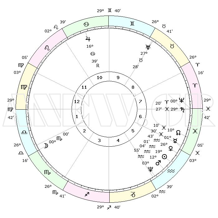| | ΘΕΣΕΙΣ ΠΛΑΝΗΤΩΝ ΑΣΤΡΟΛΟΓΙΚΟΥ ΧΑΡΤΗ ΤΗΣ ΣΤΙΓΜΗΣ ΑΥΤΗΣ | | | | Πλανήτης | Ζώδιο | Μοίρες | Δεκαήμ. | Σε οίκο | Απόκλιση | | Ακμές των οίκων | | Ηλιος | Υδροχόος | 18°57' | Δεύτερο | 6 | 15 S 08 | | 1ος | 10°29' | Παρθένος | | Σελήνη | Ζυγός | 29°12' | Τρίτο | 2 | 14 S 57 | | 2ος | 05°24' | Ζυγός | | Ερμής | Ιχθείς | 01°23' | Πρώτο | 6 | 12 S 08 | | 3ος | 04°53' | Σκορπιός | | Αφροδίτη | Υδροχόος | 26°38' | Τρίτο | 6 | 13 S 59 | | 4ος | 07°50' | Τοξότης | | Αρης | Υδροχόος | 12°01' | Δεύτερο | 5 | 18 S 12 | | 5ος | 11°24' | Αιγόκερως | | Δίας | Καρκίνος | 16°39'R | Δεύτερο | 11 | 22 N 43 | | 6ος | 12°40' | Υδροχόος | | Κρόνος | Ιχθείς | 29°26' | Τρίτο | 7 | 02 S 12 | | 7ος | 10°29' | Ιχθείς | | Ουρανός | Ταύρος | 27°28' | Τρίτο | 9 | 19 N 24 | | 8ος | 05°24' | Κριός | | Ποσειδώνας | Κριός | 00°20' | Πρώτο | 7 | 01 S 04 | | 9ος | 04°53' | Ταύρος | | Πλούτωνας | Υδροχόος | 03°55' | Πρώτο | 5 | 22 S 59 | | 10ος | 07°50' | Δίδυμοι | | Β. Δεσμός | Ιχθείς | 10°10' | Δεύτερο | 6 | 07 S 45 | | 11ος | 11°24' | Καρκίνος | | Ωροσκόπος | Παρθένος | 10°29' | Δεύτερο | | | 12ος | 12°40' | Λέων | | Μεσουράνημα | Δίδυμοι | 07°50' | Πρώτο | | | |