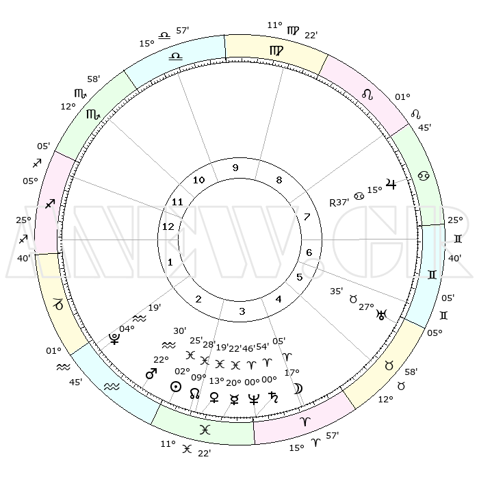 | | ΘΕΣΕΙΣ ΠΛΑΝΗΤΩΝ ΑΣΤΡΟΛΟΓΙΚΟΥ ΧΑΡΤΗ ΤΗΣ ΣΤΙΓΜΗΣ ΑΥΤΗΣ | | | | Πλανήτης | Ζώδιο | Μοίρες | Δεκαήμ. | Σε οίκο | Απόκλιση | | Ακμές των οίκων | | Ηλιος | Ιχθείς | 02°21' | Πρώτο | 3 | 10 S 38 | | 1ος | 02°46' | Τοξότης | | Σελήνη | Κριός | 16°02' | Δεύτερο | 4 | 09 N 15 | | 2ος | 04°17' | Αιγόκερως | | Ερμής | Ιχθείς | 20°19' | Τρίτο | 4 | 02 S 27 | | 3ος | 10°27' | Υδροχόος | | Αφροδίτη | Ιχθείς | 13°13' | Δεύτερο | 3 | 07 S 56 | | 4ος | 16°33' | Ιχθείς | | Αρης | Υδροχόος | 22°26' | Τρίτο | 3 | 15 S 04 | | 5ος | 17°13' | Κριός | | Δίας | Καρκίνος | 15°37'R | Δεύτερο | 8 | 22 N 51 | | 6ος | 11°54' | Ταύρος | | Κρόνος | Κριός | 00°54' | Πρώτο | 4 | 01 S 36 | | 7ος | 02°46' | Δίδυμοι | | Ουρανός | Ταύρος | 27°35' | Τρίτο | 6 | 19 N 26 | | 8ος | 04°17' | Καρκίνος | | Ποσειδώνας | Κριός | 00°46' | Πρώτο | 4 | 00 S 54 | | 9ος | 10°27' | Λέων | | Πλούτωνας | Υδροχόος | 04°19' | Πρώτο | 2 | 22 S 55 | | 10ος | 16°33' | Παρθένος | | Β. Δεσμός | Ιχθείς | 09°28' | Πρώτο | 3 | 08 S 01 | | 11ος | 17°13' | Ζυγός | | Ωροσκόπος | Τοξότης | 02°46' | Πρώτο | | | 12ος | 11°54' | Σκορπιός | | Μεσουράνημα | Παρθένος | 16°33' | Δεύτερο | | | |