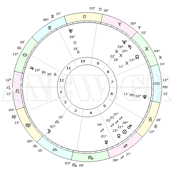 | | ΘΕΣΕΙΣ ΠΛΑΝΗΤΩΝ ΑΣΤΡΟΛΟΓΙΚΟΥ ΧΑΡΤΗ ΤΗΣ ΣΤΙΓΜΗΣ ΑΥΤΗΣ | | | | Πλανήτης | Ζώδιο | Μοίρες | Δεκαήμ. | Σε οίκο | Απόκλιση | | Ακμές των οίκων | | Ηλιος | Τοξότης | 19°22' | Δεύτερο | 1 | 23 S 00 | | 1ος | 04°11' | Τοξότης | | Σελήνη | Παρθένος | 11°23' | Δεύτερο | 9 | 07 N 26 | | 2ος | 05°55' | Αιγόκερως | | Ερμής | Σκορπιός | 29°05' | Τρίτο | 12 | 18 S 00 | | 3ος | 12°19' | Υδροχόος | | Αφροδίτη | Τοξότης | 13°01' | Δεύτερο | 1 | 22 S 02 | | 4ος | 18°25' | Ιχθείς | | Αρης | Τοξότης | 26°54' | Τρίτο | 1 | 24 S 08 | | 5ος | 18°54' | Κριός | | Δίας | Καρκίνος | 23°44'R | Τρίτο | 8 | 21 N 32 | | 6ος | 13°23' | Ταύρος | | Κρόνος | Ιχθείς | 25°26' | Τρίτο | 4 | 03 S 57 | | 7ος | 04°11' | Δίδυμοι | | Ουρανός | Ταύρος | 28°38'R | Τρίτο | 6 | 19 N 39 | | 8ος | 05°55' | Καρκίνος | | Ποσειδώνας | Ιχθείς | 29°22' | Τρίτο | 4 | 01 S 29 | | 9ος | 12°19' | Λέων | | Πλούτωνας | Υδροχόος | 02°09' | Πρώτο | 2 | 23 S 21 | | 10ος | 18°25' | Παρθένος | | Β. Δεσμός | Ιχθείς | 13°16' | Δεύτερο | 3 | 06 S 34 | | 11ος | 18°54' | Ζυγός | | Ωροσκόπος | Τοξότης | 04°11' | Πρώτο | | | 12ος | 13°23' | Σκορπιός | | Μεσουράνημα | Παρθένος | 18°25' | Δεύτερο | | | |