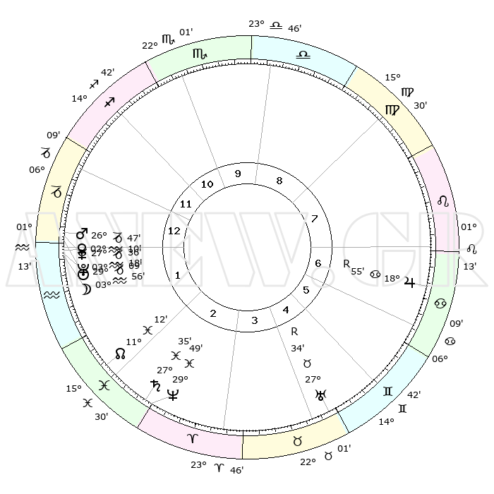 | | ΘΕΣΕΙΣ ΠΛΑΝΗΤΩΝ ΑΣΤΡΟΛΟΓΙΚΟΥ ΧΑΡΤΗ ΤΗΣ ΣΤΙΓΜΗΣ ΑΥΤΗΣ | | | | Πλανήτης | Ζώδιο | Μοίρες | Δεκαήμ. | Σε οίκο | Απόκλιση | | Ακμές των οίκων | | Ηλιος | Αιγόκερως | 29°05' | Τρίτο | 1 | 20 S 20 | | 1ος | 05°25' | Αιγόκερως | | Σελήνη | Υδροχόος | 03°05' | Πρώτο | 1 | 22 S 27 | | 2ος | 13°57' | Υδροχόος | | Ερμής | Αιγόκερως | 27°29' | Τρίτο | 1 | 22 S 36 | | 3ος | 24°13' | Ιχθείς | | Αφροδίτη | Υδροχόος | 02°05' | Πρώτο | 1 | 20 S 46 | | 4ος | 27°15' | Κριός | | Αρης | Αιγόκερως | 26°44' | Τρίτο | 1 | 21 S 47 | | 5ος | 22°44' | Ταύρος | | Δίας | Καρκίνος | 18°55'R | Δεύτερο | 7 | 22 N 23 | | 6ος | 14°14' | Δίδυμοι | | Κρόνος | Ιχθείς | 27°35' | Τρίτο | 3 | 02 S 59 | | 7ος | 05°25' | Καρκίνος | | Ουρανός | Ταύρος | 27°34'R | Τρίτο | 5 | 19 N 25 | | 8ος | 13°57' | Λέων | | Ποσειδώνας | Ιχθείς | 29°49' | Τρίτο | 3 | 01 S 17 | | 9ος | 24°13' | Παρθένος | | Πλούτωνας | Υδροχόος | 03°17' | Πρώτο | 1 | 23 S 06 | | 10ος | 27°15' | Ζυγός | | Β. Δεσμός | Ιχθείς | 11°12' | Δεύτερο | 2 | 07 S 22 | | 11ος | 22°44' | Σκορπιός | | Ωροσκόπος | Αιγόκερως | 05°25' | Πρώτο | | | 12ος | 14°14' | Τοξότης | | Μεσουράνημα | Ζυγός | 27°15' | Τρίτο | | | |