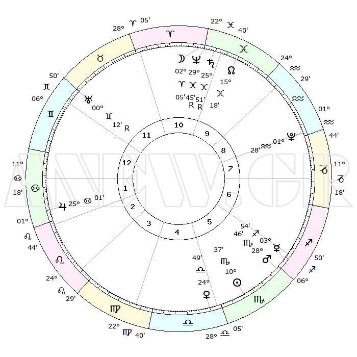 | | ΘΕΣΕΙΣ ΠΛΑΝΗΤΩΝ ΑΣΤΡΟΛΟΓΙΚΟΥ ΧΑΡΤΗ ΤΗΣ ΣΤΙΓΜΗΣ ΑΥΤΗΣ | | | | Πλανήτης | Ζώδιο | Μοίρες | Δεκαήμ. | Σε οίκο | Απόκλιση | | Ακμές των οίκων | | Ηλιος | Σκορπιός | 10°20' | Δεύτερο | 8 | 14 S 55 | | 1ος | 01°45' | Ιχθείς | | Σελήνη | Ιχθείς | 28°03' | Τρίτο | 1 | 00 N 08 | | 2ος | 17°02' | Κριός | | Ερμής | Τοξότης | 03°41' | Πρώτο | 9 | 23 S 44 | | 3ος | 19°24' | Ταύρος | | Αφροδίτη | Ζυγός | 24°28' | Τρίτο | 8 | 08 S 08 | | 4ος | 13°38' | Δίδυμοι | | Αρης | Σκορπιός | 28°34' | Τρίτο | 9 | 20 S 14 | | 5ος | 05°18' | Καρκίνος | | Δίας | Καρκίνος | 25°01' | Τρίτο | 5 | 21 N 13 | | 6ος | 29°03' | Καρκίνος | | Κρόνος | Ιχθείς | 25°51'R | Τρίτο | 1 | 03 S 54 | | 7ος | 01°45' | Παρθένος | | Ουρανός | Δίδυμοι | 00°13'R | Πρώτο | 3 | 19 N 59 | | 8ος | 17°02' | Ζυγός | | Ποσειδώνας | Ιχθείς | 29°46'R | Τρίτο | 1 | 01 S 21 | | 9ος | 19°24' | Σκορπιός | | Πλούτωνας | Υδροχόος | 01°27' | Πρώτο | 12 | 23 S 31 | | 10ος | 13°38' | Τοξότης | | Β. Δεσμός | Ιχθείς | 15°19' | Δεύτερο | 1 | 05 S 47 | | 11ος | 05°18' | Αιγόκερως | | Ωροσκόπος | Ιχθείς | 01°45' | Πρώτο | | | 12ος | 29°03' | Αιγόκερως | | Μεσουράνημα | Τοξότης | 13°38' | Δεύτερο | | | |