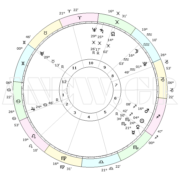 | | ΘΕΣΕΙΣ ΠΛΑΝΗΤΩΝ ΑΣΤΡΟΛΟΓΙΚΟΥ ΧΑΡΤΗ ΤΗΣ ΣΤΙΓΜΗΣ ΑΥΤΗΣ | | | | Πλανήτης | Ζώδιο | Μοίρες | Δεκαήμ. | Σε οίκο | Απόκλιση | | Ακμές των οίκων | | Ηλιος | Τοξότης | 04°41' | Πρώτο | 6 | 21 S 04 | | 1ος | 27°44' | Δίδυμοι | | Σελήνη | Υδροχόος | 15°44' | Δεύτερο | 9 | 18 S 26 | | 2ος | 18°41' | Καρκίνος | | Ερμής | Σκορπιός | 21°35'R | Τρίτο | 6 | 16 S 01 | | 3ος | 10°21' | Λέων | | Αφροδίτη | Σκορπιός | 24°48' | Τρίτο | 6 | 18 S 08 | | 4ος | 06°18' | Παρθένος | | Αρης | Τοξότης | 16°07' | Δεύτερο | 6 | 23 S 20 | | 5ος | 09°53' | Ζυγός | | Δίας | Καρκίνος | 24°47'R | Τρίτο | 2 | 21 N 19 | | 6ος | 20°01' | Σκορπιός | | Κρόνος | Ιχθείς | 25°17'R | Τρίτο | 10 | 04 S 04 | | 7ος | 27°44' | Τοξότης | | Ουρανός | Ταύρος | 29°13'R | Τρίτο | 12 | 19 N 47 | | 8ος | 18°41' | Αιγόκερως | | Ποσειδώνας | Ιχθείς | 29°26'R | Τρίτο | 10 | 01 S 28 | | 9ος | 10°21' | Υδροχόος | | Πλούτωνας | Υδροχόος | 01°49' | Πρώτο | 8 | 23 S 25 | | 10ος | 06°18' | Ιχθείς | | Β. Δεσμός | Ιχθείς | 14°02' | Δεύτερο | 10 | 06 S 17 | | 11ος | 09°53' | Κριός | | Ωροσκόπος | Δίδυμοι | 27°44' | Τρίτο | | | 12ος | 20°01' | Ταύρος | | Μεσουράνημα | Ιχθείς | 06°18' | Πρώτο | | | |