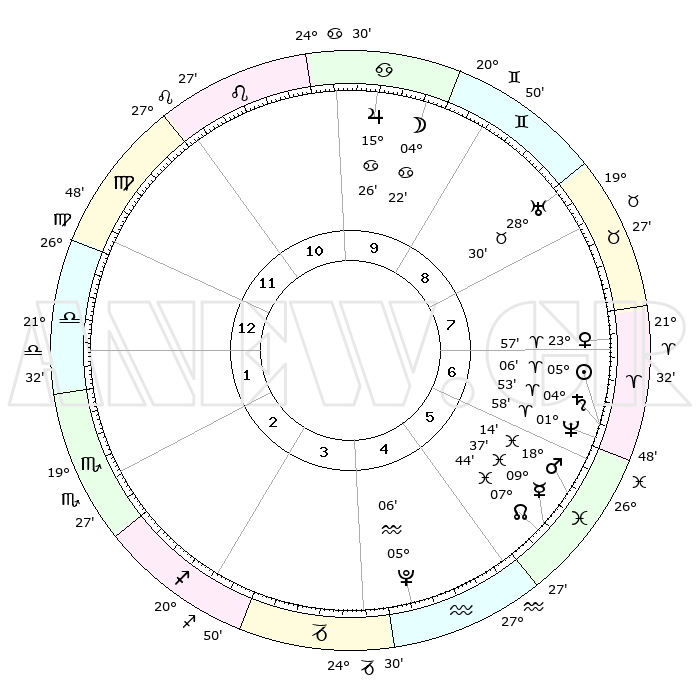| | ΘΕΣΕΙΣ ΠΛΑΝΗΤΩΝ ΑΣΤΡΟΛΟΓΙΚΟΥ ΧΑΡΤΗ ΤΗΣ ΣΤΙΓΜΗΣ ΑΥΤΗΣ | | | | Πλανήτης | Ζώδιο | Μοίρες | Δεκαήμ. | Σε οίκο | Απόκλιση | | Ακμές των οίκων | | Ηλιος | Κριός | 05°02' | Πρώτο | 7 | 02 N 00 | | 1ος | 02°32' | Ζυγός | | Σελήνη | Καρκίνος | 03°27' | Πρώτο | 10 | 28 N 08 | | 2ος | 29°18' | Ζυγός | | Ερμής | Ιχθείς | 09°35' | Πρώτο | 6 | 08 S 06 | | 3ος | 29°50' | Σκορπιός | | Αφροδίτη | Κριός | 23°52' | Τρίτο | 7 | 08 N 37 | | 4ος | 02°51' | Αιγόκερως | | Αρης | Ιχθείς | 18°11' | Δεύτερο | 6 | 05 S 39 | | 5ος | 05°48' | Υδροχόος | | Δίας | Καρκίνος | 15°26' | Δεύτερο | 10 | 22 N 54 | | 6ος | 06°08' | Ιχθείς | | Κρόνος | Κριός | 04°52' | Πρώτο | 7 | 00 S 01 | | 7ος | 02°32' | Κριός | | Ουρανός | Ταύρος | 28°30' | Τρίτο | 8 | 19 N 39 | | 8ος | 29°18' | Κριός | | Ποσειδώνας | Κριός | 01°58' | Πρώτο | 6 | 00 S 25 | | 9ος | 29°50' | Ταύρος | | Πλούτωνας | Υδροχόος | 05°06' | Πρώτο | 4 | 22 S 48 | | 10ος | 02°51' | Καρκίνος | | Β. Δεσμός | Ιχθείς | 07°44' | Πρώτο | 6 | 08 S 40 | | 11ος | 05°48' | Λέων | | Ωροσκόπος | Ζυγός | 02°32' | Πρώτο | | | 12ος | 06°08' | Παρθένος | | Μεσουράνημα | Καρκίνος | 02°51' | Πρώτο | | | |