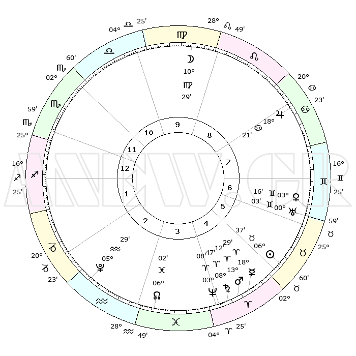 | | ΘΕΣΕΙΣ ΠΛΑΝΗΤΩΝ ΑΣΤΡΟΛΟΓΙΚΟΥ ΧΑΡΤΗ ΤΗΣ ΣΤΙΓΜΗΣ ΑΥΤΗΣ | | | | Πλανήτης | Ζώδιο | Μοίρες | Δεκαήμ. | Σε οίκο | Απόκλιση | | Ακμές των οίκων | | Ηλιος | Ταύρος | 06°33' | Πρώτο | 6 | 13 N 42 | | 1ος | 26°11' | Σκορπιός | | Σελήνη | Παρθένος | 09°36' | Πρώτο | 10 | 07 N 47 | | 2ος | 26°49' | Τοξότης | | Ερμής | Κριός | 18°22' | Δεύτερο | 5 | 05 N 04 | | 3ος | 01°54' | Υδροχόος | | Αφροδίτη | Δίδυμοι | 03°11' | Πρώτο | 7 | 21 N 29 | | 4ος | 07°49' | Ιχθείς | | Αρης | Κριός | 13°09' | Δεύτερο | 5 | 04 N 21 | | 5ος | 09°18' | Κριός | | Δίας | Καρκίνος | 18°21' | Δεύτερο | 8 | 22 N 34 | | 6ος | 04°52' | Ταύρος | | Κρόνος | Κριός | 08°47' | Πρώτο | 4 | 01 N 29 | | 7ος | 26°11' | Ταύρος | | Ουρανός | Δίδυμοι | 00°03' | Πρώτο | 7 | 20 N 00 | | 8ος | 26°49' | Δίδυμοι | | Ποσειδώνας | Κριός | 03°08' | Πρώτο | 4 | 00 N 02 | | 9ος | 01°54' | Λέων | | Πλούτωνας | Υδροχόος | 05°29' | Πρώτο | 3 | 22 S 48 | | 10ος | 07°49' | Παρθένος | | Β. Δεσμός | Ιχθείς | 06°02' | Πρώτο | 3 | 09 S 18 | | 11ος | 09°18' | Ζυγός | | Ωροσκόπος | Σκορπιός | 26°11' | Τρίτο | | | 12ος | 04°52' | Σκορπιός | | Μεσουράνημα | Παρθένος | 07°49' | Πρώτο | | | |
