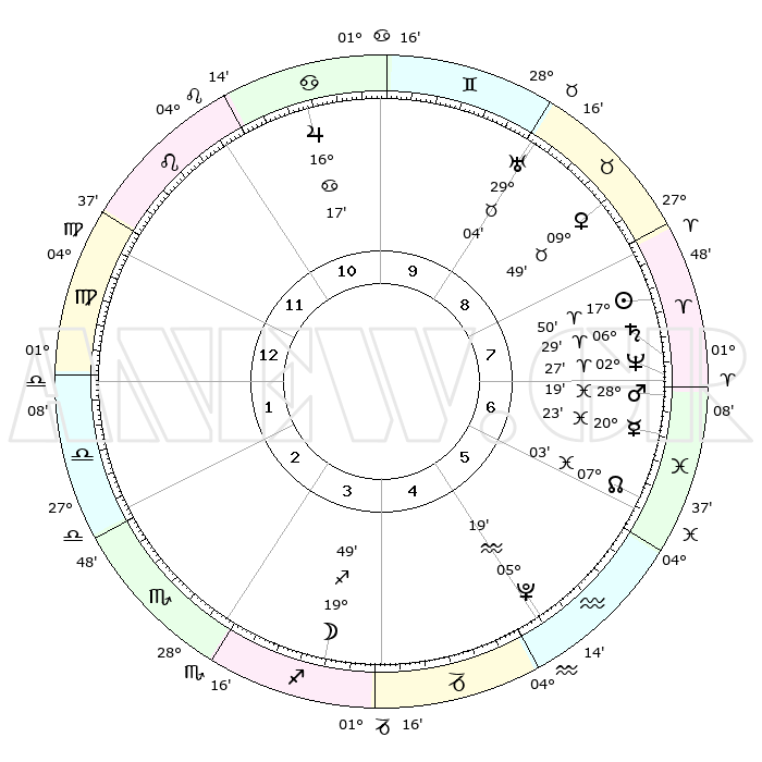 | | ΘΕΣΕΙΣ ΠΛΑΝΗΤΩΝ ΑΣΤΡΟΛΟΓΙΚΟΥ ΧΑΡΤΗ ΤΗΣ ΣΤΙΓΜΗΣ ΑΥΤΗΣ | | | | Πλανήτης | Ζώδιο | Μοίρες | Δεκαήμ. | Σε οίκο | Απόκλιση | | Ακμές των οίκων | | Ηλιος | Κριός | 17°46' | Δεύτερο | 8 | 06 N 58 | | 1ος | 12°07' | Παρθένος | | Σελήνη | Τοξότης | 19°03' | Δεύτερο | 4 | 28 S 02 | | 2ος | 07°11' | Ζυγός | | Ερμής | Ιχθείς | 20°19' | Τρίτο | 7 | 05 S 48 | | 3ος | 06°46' | Σκορπιός | | Αφροδίτη | Ταύρος | 09°44' | Πρώτο | 9 | 14 N 34 | | 4ος | 09°43' | Τοξότης | | Αρης | Ιχθείς | 28°16' | Τρίτο | 7 | 01 S 37 | | 5ος | 13°13' | Αιγόκερως | | Δίας | Καρκίνος | 16°16' | Δεύτερο | 11 | 22 N 49 | | 6ος | 14°23' | Υδροχόος | | Κρόνος | Κριός | 06°29' | Πρώτο | 7 | 00 N 37 | | 7ος | 12°07' | Ιχθείς | | Ουρανός | Ταύρος | 29°04' | Τρίτο | 9 | 19 N 47 | | 8ος | 07°11' | Κριός | | Ποσειδώνας | Κριός | 02°27' | Πρώτο | 7 | 00 S 14 | | 9ος | 06°46' | Ταύρος | | Πλούτωνας | Υδροχόος | 05°19' | Πρώτο | 5 | 22 S 47 | | 10ος | 09°43' | Δίδυμοι | | Β. Δεσμός | Ιχθείς | 07°03' | Πρώτο | 6 | 08 S 55 | | 11ος | 13°13' | Καρκίνος | | Ωροσκόπος | Παρθένος | 12°07' | Δεύτερο | | | 12ος | 14°23' | Λέων | | Μεσουράνημα | Δίδυμοι | 09°43' | Πρώτο | | | |