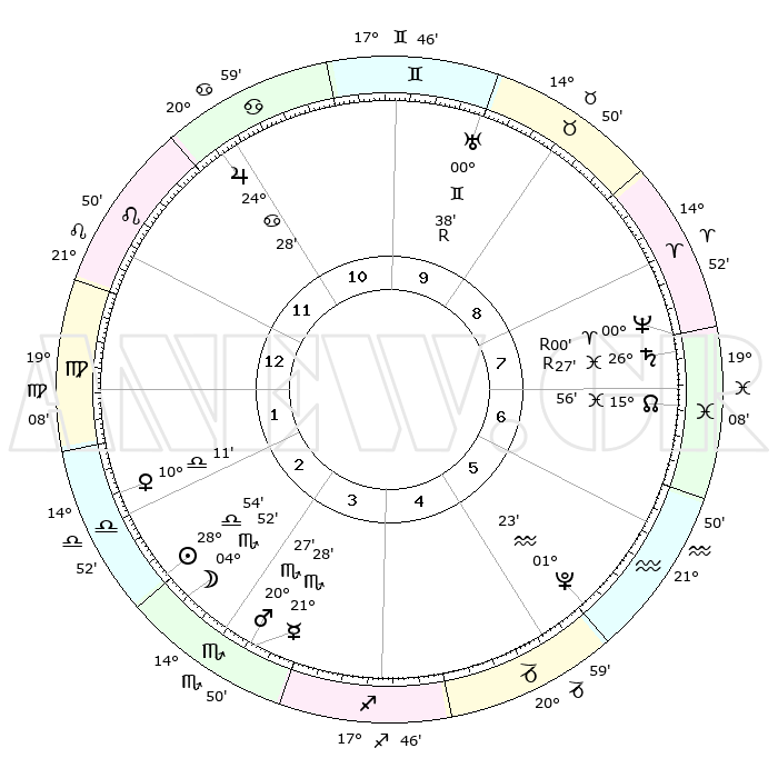 | ΘΕΣΕΙΣ ΠΛΑΝΗΤΩΝ ΑΣΤΡΟΛΟΓΙΚΟΥ ΧΑΡΤΗ ΤΗΣ ΣΤΙΓΜΗΣ ΑΥΤΗΣ | | Πλανήτης | Ζώδιο | Μοίρες | Δεκαήμ. | Σε οίκο | Απόκλιση | | Ακμές των οίκων | Ηλιος | Ζυγός | 28°49' | Τρίτο | 3 | 11 S 03 | | 1ος | 23°10' | Λέων | Σελήνη | Σκορπιός | 03°48' | Πρώτο | 3 | 16 S 16 | | 2ος | 16°18' | Παρθένος | Ερμής | Σκορπιός | 21°22' | Τρίτο | 4 | 20 S 25 | | 3ος | 14°18' | Ζυγός | Αφροδίτη | Ζυγός | 10°04' | Δεύτερο | 2 | 02 S 34 | | 4ος | 17°05' | Σκορπιός | Αρης | Σκορπιός | 20°23' | Τρίτο | 4 | 18 S 07 | | 5ος | 21°45' | Τοξότης | Δίας | Καρκίνος | 24°28' | Τρίτο | 12 | 21 N 17 | | 6ος | 24°19' | Αιγόκερως | Κρόνος | Ιχθείς | 26°27'R | Τρίτο | 8 | 03 S 42 | | 7ος | 23°10' | Υδροχόος | Ουρανός | Δίδυμοι | 00°38'R | Πρώτο | 10 | 20 N 04 | | 8ος | 16°18' | Ιχθείς | Ποσειδώνας | Κριός | 00°00'R | Πρώτο | 8 | 01 S 15 | | 9ος | 14°18' | Κριός | Πλούτωνας | Υδροχόος | 01°23' | Πρώτο | 6 | 23 S 32 | | 10ος | 17°05' | Ταύρος | Β. Δεσμός | Ιχθείς | 15°56' | Δεύτερο | 7 | 05 S 33 | | 11ος | 21°45' | Δίδυμοι | Ωροσκόπος | Λέων | 23°10' | Τρίτο | | | 12ος | 24°19' | Καρκίνος | Μεσουράνημα | Ταύρος | 17°05' | Δεύτερο | | | |