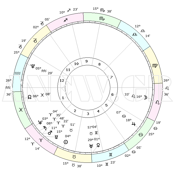 | | ΘΕΣΕΙΣ ΠΛΑΝΗΤΩΝ ΑΣΤΡΟΛΟΓΙΚΟΥ ΧΑΡΤΗ ΤΗΣ ΣΤΙΓΜΗΣ ΑΥΤΗΣ | | | | Πλανήτης | Ζώδιο | Μοίρες | Δεκαήμ. | Σε οίκο | Απόκλιση | | Ακμές των οίκων | | Ηλιος | Ταύρος | 04°48' | Πρώτο | 3 | 13 N 07 | | 1ος | 02°51' | Υδροχόος | | Σελήνη | Λέων | 15°53' | Δεύτερο | 7 | 17 N 51 | | 2ος | 17°24' | Ιχθείς | | Ερμής | Κριός | 15°17' | Δεύτερο | 2 | 03 N 46 | | 3ος | 25°23' | Κριός | | Αφροδίτη | Δίδυμοι | 01°00' | Πρώτο | 4 | 20 N 58 | | 4ος | 23°22' | Ταύρος | | Αρης | Κριός | 11°46' | Δεύτερο | 2 | 03 N 48 | | 5ος | 15°55' | Δίδυμοι | | Δίας | Καρκίνος | 18°07' | Δεύτερο | 6 | 22 N 35 | | 6ος | 07°27' | Καρκίνος | | Κρόνος | Κριός | 08°34' | Πρώτο | 2 | 01 N 25 | | 7ος | 02°51' | Λέων | | Ουρανός | Ταύρος | 29°57' | Τρίτο | 4 | 19 N 58 | | 8ος | 17°24' | Παρθένος | | Ποσειδώνας | Κριός | 03°04' | Πρώτο | 2 | 00 N 01 | | 9ος | 25°23' | Ζυγός | | Πλούτωνας | Υδροχόος | 05°29' | Πρώτο | 1 | 22 S 48 | | 10ος | 23°22' | Σκορπιός | | Β. Δεσμός | Ιχθείς | 06°08' | Πρώτο | 1 | 09 S 16 | | 11ος | 15°55' | Τοξότης | | Ωροσκόπος | Υδροχόος | 02°51' | Πρώτο | | | 12ος | 07°27' | Αιγόκερως | | Μεσουράνημα | Σκορπιός | 23°22' | Τρίτο | | | |