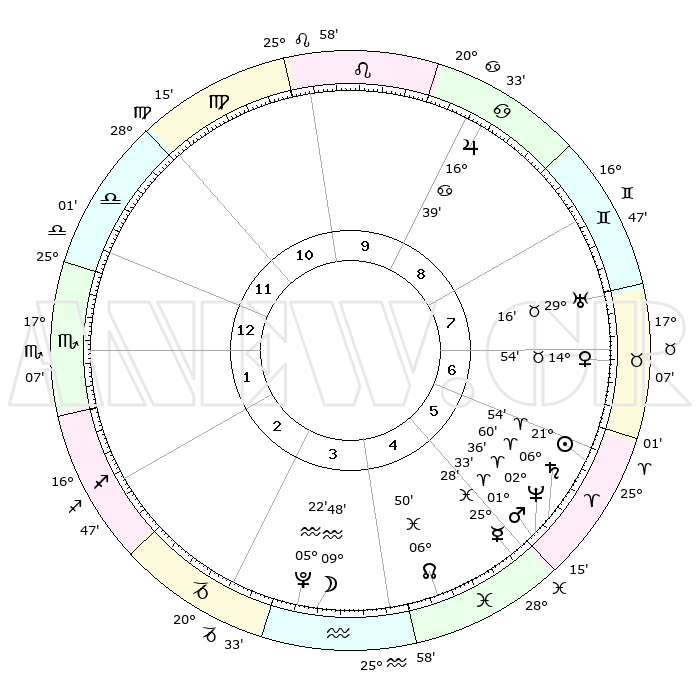| | ΘΕΣΕΙΣ ΠΛΑΝΗΤΩΝ ΑΣΤΡΟΛΟΓΙΚΟΥ ΧΑΡΤΗ ΤΗΣ ΣΤΙΓΜΗΣ ΑΥΤΗΣ | | | | Πλανήτης | Ζώδιο | Μοίρες | Δεκαήμ. | Σε οίκο | Απόκλιση | | Ακμές των οίκων | | Ηλιος | Κριός | 21°51' | Τρίτο | 6 | 08 N 30 | | 1ος | 29°12' | Ζυγός | | Σελήνη | Υδροχόος | 09°02' | Πρώτο | 4 | 20 S 25 | | 2ος | 27°34' | Σκορπιός | | Ερμής | Ιχθείς | 25°24' | Τρίτο | 5 | 04 S 05 | | 3ος | 29°27' | Τοξότης | | Αφροδίτη | Ταύρος | 14°50' | Δεύτερο | 7 | 16 N 18 | | 4ος | 03°36' | Υδροχόος | | Αρης | Κριός | 01°30' | Πρώτο | 5 | 00 S 19 | | 5ος | 06°31' | Ιχθείς | | Δίας | Καρκίνος | 16°39' | Δεύτερο | 9 | 22 N 46 | | 6ος | 05°16' | Κριός | | Κρόνος | Κριός | 06°59' | Πρώτο | 6 | 00 N 48 | | 7ος | 29°12' | Κριός | | Ουρανός | Ταύρος | 29°16' | Τρίτο | 8 | 19 N 49 | | 8ος | 27°34' | Ταύρος | | Ποσειδώνας | Κριός | 02°36' | Πρώτο | 5 | 00 S 10 | | 9ος | 29°27' | Δίδυμοι | | Πλούτωνας | Υδροχόος | 05°22' | Πρώτο | 4 | 22 S 47 | | 10ος | 03°36' | Λέων | | Β. Δεσμός | Ιχθείς | 06°50' | Πρώτο | 5 | 09 S 00 | | 11ος | 06°31' | Παρθένος | | Ωροσκόπος | Ζυγός | 29°12' | Τρίτο | | | 12ος | 05°16' | Ζυγός | | Μεσουράνημα | Λέων | 03°36' | Πρώτο | | | |