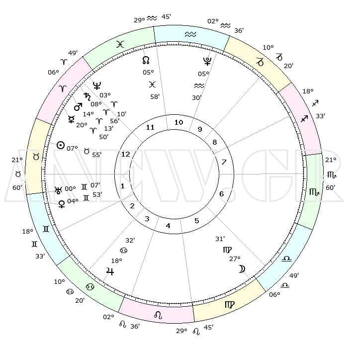 | | ΘΕΣΕΙΣ ΠΛΑΝΗΤΩΝ ΑΣΤΡΟΛΟΓΙΚΟΥ ΧΑΡΤΗ ΤΗΣ ΣΤΙΓΜΗΣ ΑΥΤΗΣ | | | | Πλανήτης | Ζώδιο | Μοίρες | Δεκαήμ. | Σε οίκο | Απόκλιση | | Ακμές των οίκων | | Ηλιος | Ταύρος | 07°51' | Πρώτο | 1 | 14 N 07 | | 1ος | 19°04' | Κριός | | Σελήνη | Παρθένος | 26°43' | Τρίτο | 6 | 00 S 15 | | 2ος | 24°20' | Ταύρος | | Ερμής | Κριός | 20°44' | Τρίτο | 1 | 06 N 03 | | 3ος | 19°07' | Δίδυμοι | | Αφροδίτη | Δίδυμοι | 04°48' | Πρώτο | 2 | 21 N 51 | | 4ος | 10°51' | Καρκίνος | | Αρης | Κριός | 14°10' | Δεύτερο | 12 | 04 N 45 | | 5ος | 04°18' | Λέων | | Δίας | Καρκίνος | 18°31' | Δεύτερο | 4 | 22 N 32 | | 6ος | 04°56' | Παρθένος | | Κρόνος | Κριός | 08°56' | Πρώτο | 12 | 01 N 33 | | 7ος | 19°04' | Ζυγός | | Ουρανός | Δίδυμοι | 00°07' | Πρώτο | 2 | 20 N 00 | | 8ος | 24°20' | Σκορπιός | | Ποσειδώνας | Κριός | 03°10' | Πρώτο | 12 | 00 N 03 | | 9ος | 19°07' | Τοξότης | | Πλούτωνας | Υδροχόος | 05°29' | Πρώτο | 11 | 22 S 48 | | 10ος | 10°51' | Αιγόκερως | | Β. Δεσμός | Ιχθείς | 05°58' | Πρώτο | 12 | 09 S 19 | | 11ος | 04°18' | Υδροχόος | | Ωροσκόπος | Κριός | 19°04' | Δεύτερο | | | 12ος | 04°56' | Ιχθείς | | Μεσουράνημα | Αιγόκερως | 10°51' | Δεύτερο | | | |