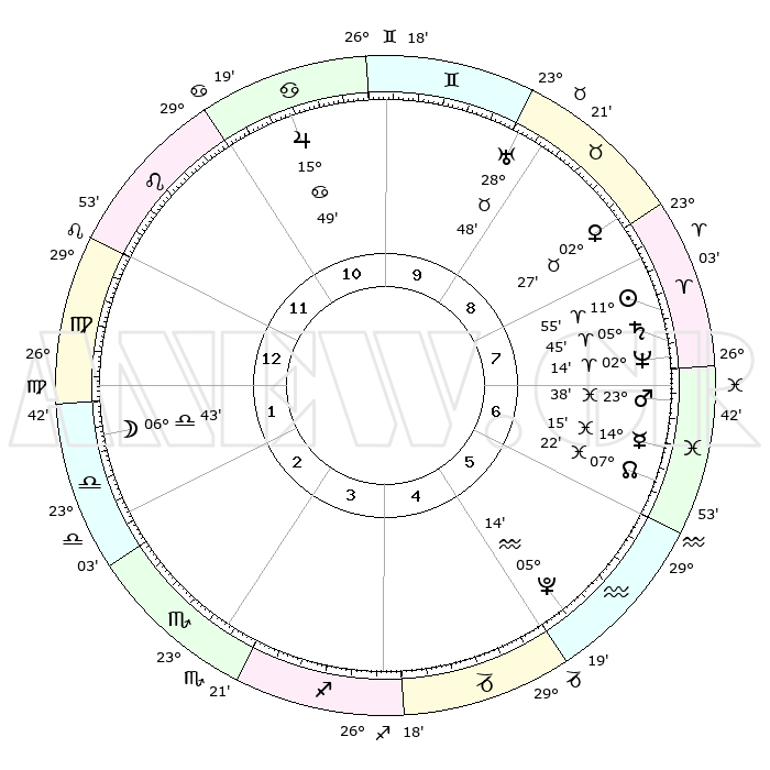 | | ΘΕΣΕΙΣ ΠΛΑΝΗΤΩΝ ΑΣΤΡΟΛΟΓΙΚΟΥ ΧΑΡΤΗ ΤΗΣ ΣΤΙΓΜΗΣ ΑΥΤΗΣ | | | | Πλανήτης | Ζώδιο | Μοίρες | Δεκαήμ. | Σε οίκο | Απόκλιση | | Ακμές των οίκων | | Ηλιος | Κριός | 11°51' | Δεύτερο | 8 | 04 N 41 | | 1ος | 06°42' | Παρθένος | | Σελήνη | Ζυγός | 05°51' | Πρώτο | 2 | 04 S 30 | | 2ος | 01°15' | Ζυγός | | Ερμής | Ιχθείς | 14°12' | Δεύτερο | 7 | 07 S 30 | | 3ος | 00°28' | Σκορπιός | | Αφροδίτη | Ταύρος | 02°22' | Πρώτο | 9 | 11 N 54 | | 4ος | 03°25' | Τοξότης | | Αρης | Ιχθείς | 23°35' | Τρίτο | 7 | 03 S 30 | | 5ος | 07°12' | Αιγόκερως | | Δίας | Καρκίνος | 15°49' | Δεύτερο | 11 | 22 N 52 | | 6ος | 08°41' | Υδροχόος | | Κρόνος | Κριός | 05°44' | Πρώτο | 8 | 00 N 19 | | 7ος | 06°42' | Ιχθείς | | Ουρανός | Ταύρος | 28°47' | Τρίτο | 9 | 19 N 43 | | 8ος | 01°15' | Κριός | | Ποσειδώνας | Κριός | 02°14' | Πρώτο | 8 | 00 S 19 | | 9ος | 00°28' | Ταύρος | | Πλούτωνας | Υδροχόος | 05°14' | Πρώτο | 5 | 22 S 47 | | 10ος | 03°25' | Δίδυμοι | | Β. Δεσμός | Ιχθείς | 07°22' | Πρώτο | 7 | 08 S 48 | | 11ος | 07°12' | Καρκίνος | | Ωροσκόπος | Παρθένος | 06°42' | Πρώτο | | | 12ος | 08°41' | Λέων | | Μεσουράνημα | Δίδυμοι | 03°25' | Πρώτο | | | |