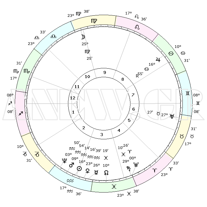 | | ΘΕΣΕΙΣ ΠΛΑΝΗΤΩΝ ΑΣΤΡΟΛΟΓΙΚΟΥ ΧΑΡΤΗ ΤΗΣ ΣΤΙΓΜΗΣ ΑΥΤΗΣ | | | | Πλανήτης | Ζώδιο | Μοίρες | Δεκαήμ. | Σε οίκο | Απόκλιση | | Ακμές των οίκων | | Ηλιος | Υδροχόος | 16°08' | Δεύτερο | 3 | 16 S 00 | | 1ος | 11°24' | Σκορπιός | | Σελήνη | Παρθένος | 24°13' | Τρίτο | 11 | 01 N 02 | | 2ος | 10°34' | Τοξότης | | Ερμής | Υδροχόος | 26°29' | Τρίτο | 4 | 14 S 09 | | 3ος | 13°38' | Αιγόκερως | | Αφροδίτη | Υδροχόος | 23°09' | Τρίτο | 4 | 15 S 08 | | 4ος | 18°38' | Υδροχόος | | Αρης | Υδροχόος | 09°50' | Πρώτο | 3 | 18 S 48 | | 5ος | 21°15' | Ιχθείς | | Δίας | Καρκίνος | 16°56'R | Δεύτερο | 9 | 22 N 40 | | 6ος | 18°44' | Κριός | | Κρόνος | Ιχθείς | 29°09' | Τρίτο | 5 | 02 S 19 | | 7ος | 11°24' | Ταύρος | | Ουρανός | Ταύρος | 27°27' | Τρίτο | 7 | 19 N 24 | | 8ος | 10°35' | Δίδυμοι | | Ποσειδώνας | Κριός | 00°15' | Πρώτο | 5 | 01 S 06 | | 9ος | 13°38' | Καρκίνος | | Πλούτωνας | Υδροχόος | 03°50' | Πρώτο | 3 | 23 S 00 | | 10ος | 18°38' | Λέων | | Β. Δεσμός | Ιχθείς | 10°19' | Δεύτερο | 4 | 07 S 42 | | 11ος | 21°15' | Παρθένος | | Ωροσκόπος | Σκορπιός | 11°24' | Δεύτερο | | | 12ος | 18°44' | Ζυγός | | Μεσουράνημα | Λέων | 18°38' | Δεύτερο | | | |