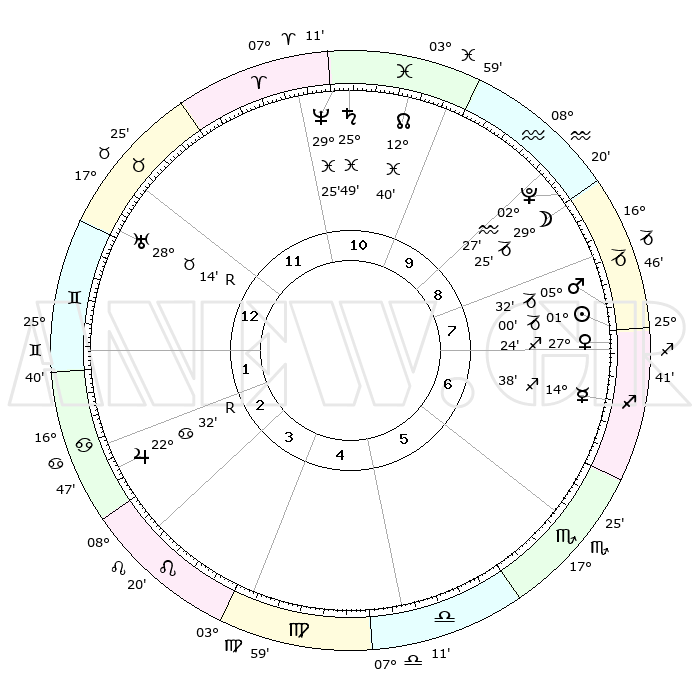 | | ΘΕΣΕΙΣ ΠΛΑΝΗΤΩΝ ΑΣΤΡΟΛΟΓΙΚΟΥ ΧΑΡΤΗ ΤΗΣ ΣΤΙΓΜΗΣ ΑΥΤΗΣ | | | | Πλανήτης | Ζώδιο | Μοίρες | Δεκαήμ. | Σε οίκο | Απόκλιση | | Ακμές των οίκων | | Ηλιος | Αιγόκερως | 00°56' | Πρώτο | 8 | 23 S 26 | | 1ος | 25°20' | Ταύρος | | Σελήνη | Αιγόκερως | 28°26' | Τρίτο | 9 | 23 S 50 | | 2ος | 21°08' | Δίδυμοι | | Ερμής | Τοξότης | 14°31' | Δεύτερο | 7 | 21 S 58 | | 3ος | 12°44' | Καρκίνος | | Αφροδίτη | Τοξότης | 27°18' | Τρίτο | 8 | 23 S 33 | | 4ος | 05°11' | Λέων | | Αρης | Αιγόκερως | 05°28' | Πρώτο | 8 | 24 S 09 | | 5ος | 02°52' | Παρθένος | | Δίας | Καρκίνος | 22°32'R | Τρίτο | 3 | 21 N 46 | | 6ος | 10°32' | Ζυγός | | Κρόνος | Ιχθείς | 25°48' | Τρίτο | 11 | 03 S 46 | | 7ος | 25°20' | Σκορπιός | | Ουρανός | Ταύρος | 28°14'R | Τρίτο | 1 | 19 N 34 | | 8ος | 21°08' | Τοξότης | | Ποσειδώνας | Ιχθείς | 29°25' | Τρίτο | 11 | 01 S 28 | | 9ος | 12°44' | Αιγόκερως | | Πλούτωνας | Υδροχόος | 02°27' | Πρώτο | 9 | 23 S 17 | | 10ος | 05°11' | Υδροχόος | | Β. Δεσμός | Ιχθείς | 12°40' | Δεύτερο | 11 | 06 S 48 | | 11ος | 02°52' | Ιχθείς | | Ωροσκόπος | Ταύρος | 25°20' | Τρίτο | | | 12ος | 10°32' | Κριός | | Μεσουράνημα | Υδροχόος | 05°11' | Πρώτο | | | |