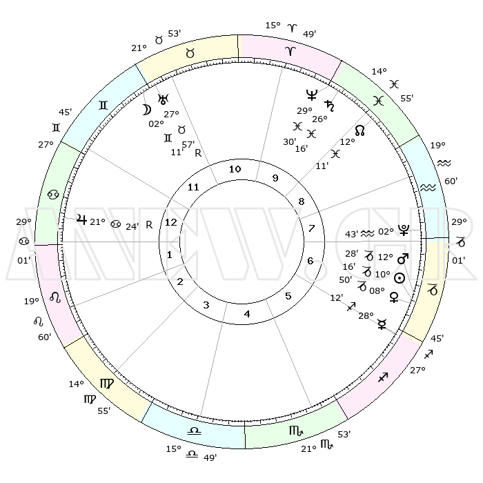 | | ΘΕΣΕΙΣ ΠΛΑΝΗΤΩΝ ΑΣΤΡΟΛΟΓΙΚΟΥ ΧΑΡΤΗ ΤΗΣ ΣΤΙΓΜΗΣ ΑΥΤΗΣ | | | | Πλανήτης | Ζώδιο | Μοίρες | Δεκαήμ. | Σε οίκο | Απόκλιση | | Ακμές των οίκων | | Ηλιος | Αιγόκερως | 10°11' | Δεύτερο | 7 | 23 S 03 | | 1ος | 04°57' | Καρκίνος | | Σελήνη | Δίδυμοι | 01°00' | Πρώτο | 12 | 25 N 14 | | 2ος | 25°30' | Καρκίνος | | Ερμής | Τοξότης | 28°05' | Τρίτο | 6 | 23 S 57 | | 3ος | 17°40' | Λέων | | Αφροδίτη | Αιγόκερως | 08°44' | Πρώτο | 7 | 23 S 38 | | 4ος | 14°47' | Παρθένος | | Αρης | Αιγόκερως | 12°24' | Δεύτερο | 7 | 23 S 44 | | 5ος | 19°28' | Ζυγός | | Δίας | Καρκίνος | 21°24'R | Τρίτο | 1 | 21 N 58 | | 6ος | 29°01' | Σκορπιός | | Κρόνος | Ιχθείς | 26°16' | Τρίτο | 10 | 03 S 34 | | 7ος | 04°57' | Αιγόκερως | | Ουρανός | Ταύρος | 27°57'R | Τρίτο | 11 | 19 N 30 | | 8ος | 25°30' | Αιγόκερως | | Ποσειδώνας | Ιχθείς | 29°30' | Τρίτο | 10 | 01 S 25 | | 9ος | 17°40' | Υδροχόος | | Πλούτωνας | Υδροχόος | 02°43' | Πρώτο | 8 | 23 S 13 | | 10ος | 14°47' | Ιχθείς | | Β. Δεσμός | Ιχθείς | 12°11' | Δεύτερο | 9 | 06 S 59 | | 11ος | 19°28' | Κριός | | Ωροσκόπος | Καρκίνος | 04°57' | Πρώτο | | | 12ος | 29°01' | Ταύρος | | Μεσουράνημα | Ιχθείς | 14°47' | Δεύτερο | | | |