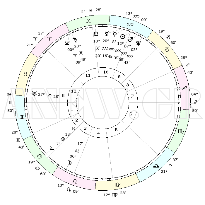 | | ΘΕΣΕΙΣ ΠΛΑΝΗΤΩΝ ΑΣΤΡΟΛΟΓΙΚΟΥ ΧΑΡΤΗ ΤΗΣ ΣΤΙΓΜΗΣ ΑΥΤΗΣ | | | | Πλανήτης | Ζώδιο | Μοίρες | Δεκαήμ. | Σε οίκο | Απόκλιση | | Ακμές των οίκων | | Ηλιος | Υδροχόος | 12°30' | Δεύτερο | 11 | 17 S 03 | | 1ος | 00°33' | Ταύρος | | Σελήνη | Λέων | 05°15' | Πρώτο | 4 | 21 N 47 | | 2ος | 02°37' | Δίδυμοι | | Ερμής | Υδροχόος | 20°09' | Τρίτο | 11 | 16 S 32 | | 3ος | 26°07' | Δίδυμοι | | Αφροδίτη | Υδροχόος | 18°39' | Δεύτερο | 11 | 16 S 32 | | 4ος | 17°48' | Καρκίνος | | Αρης | Υδροχόος | 07°02' | Πρώτο | 10 | 19 S 31 | | 5ος | 12°16' | Λέων | | Δίας | Καρκίνος | 17°19'R | Δεύτερο | 3 | 22 N 37 | | 6ος | 15°05' | Παρθένος | | Κρόνος | Ιχθείς | 28°48' | Τρίτο | 12 | 02 S 28 | | 7ος | 00°33' | Σκορπιός | | Ουρανός | Ταύρος | 27°28'R | Τρίτο | 1 | 19 N 24 | | 8ος | 02°37' | Τοξότης | | Ποσειδώνας | Κριός | 00°09' | Πρώτο | 12 | 01 S 09 | | 9ος | 26°07' | Τοξότης | | Πλούτωνας | Υδροχόος | 03°43' | Πρώτο | 10 | 23 S 01 | | 10ος | 17°48' | Αιγόκερως | | Β. Δεσμός | Ιχθείς | 10°30' | Δεύτερο | 11 | 07 S 38 | | 11ος | 12°16' | Υδροχόος | | Ωροσκόπος | Ταύρος | 00°33' | Πρώτο | | | 12ος | 15°05' | Ιχθείς | | Μεσουράνημα | Αιγόκερως | 17°48' | Δεύτερο | | | |