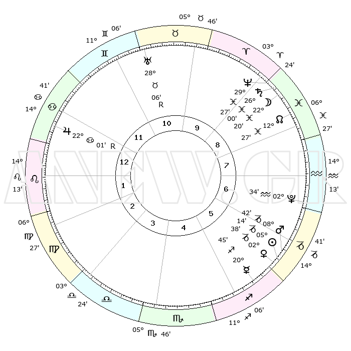 | | ΘΕΣΕΙΣ ΠΛΑΝΗΤΩΝ ΑΣΤΡΟΛΟΓΙΚΟΥ ΧΑΡΤΗ ΤΗΣ ΣΤΙΓΜΗΣ ΑΥΤΗΣ | | | | Πλανήτης | Ζώδιο | Μοίρες | Δεκαήμ. | Σε οίκο | Απόκλιση | | Ακμές των οίκων | | Ηλιος | Αιγόκερως | 05°09' | Πρώτο | 6 | 23 S 20 | | 1ος | 22°32' | Καρκίνος | | Σελήνη | Ιχθείς | 21°21' | Τρίτο | 9 | 02 S 37 | | 2ος | 13°10' | Λέων | | Ερμής | Τοξότης | 20°39' | Τρίτο | 6 | 23 S 03 | | 3ος | 07°13' | Παρθένος | | Αφροδίτη | Αιγόκερως | 02°32' | Πρώτο | 6 | 23 S 43 | | 4ος | 07°14' | Ζυγός | | Αρης | Αιγόκερως | 08°38' | Πρώτο | 6 | 24 S 00 | | 5ος | 13°17' | Σκορπιός | | Δίας | Καρκίνος | 22°02'R | Τρίτο | 12 | 21 N 51 | | 6ος | 20°15' | Τοξότης | | Κρόνος | Ιχθείς | 25°60' | Τρίτο | 9 | 03 S 41 | | 7ος | 22°32' | Αιγόκερως | | Ουρανός | Ταύρος | 28°06'R | Τρίτο | 11 | 19 N 32 | | 8ος | 13°10' | Υδροχόος | | Ποσειδώνας | Ιχθείς | 29°27' | Τρίτο | 9 | 01 S 27 | | 9ος | 07°13' | Ιχθείς | | Πλούτωνας | Υδροχόος | 02°34' | Πρώτο | 7 | 23 S 15 | | 10ος | 07°14' | Κριός | | Β. Δεσμός | Ιχθείς | 12°27' | Δεύτερο | 9 | 06 S 53 | | 11ος | 13°17' | Ταύρος | | Ωροσκόπος | Καρκίνος | 22°32' | Τρίτο | | | 12ος | 20°15' | Δίδυμοι | | Μεσουράνημα | Κριός | 07°14' | Πρώτο | | | |