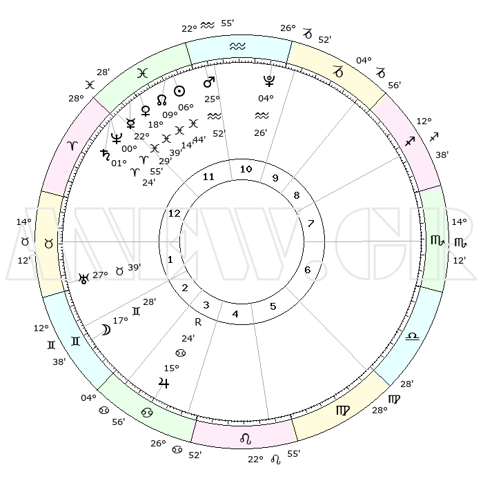 | | ΘΕΣΕΙΣ ΠΛΑΝΗΤΩΝ ΑΣΤΡΟΛΟΓΙΚΟΥ ΧΑΡΤΗ ΤΗΣ ΣΤΙΓΜΗΣ ΑΥΤΗΣ | | | | Πλανήτης | Ζώδιο | Μοίρες | Δεκαήμ. | Σε οίκο | Απόκλιση | | Ακμές των οίκων | | Ηλιος | Ιχθείς | 06°40' | Πρώτο | 12 | 09 S 04 | | 1ος | 15°35' | Κριός | | Σελήνη | Δίδυμοι | 16°42' | Δεύτερο | 2 | 27 N 59 | | 2ος | 21°48' | Ταύρος | | Ερμής | Ιχθείς | 22°29' | Τρίτο | 12 | 00 S 38 | | 3ος | 17°01' | Δίδυμοι | | Αφροδίτη | Ιχθείς | 18°35' | Δεύτερο | 12 | 05 S 49 | | 4ος | 08°50' | Καρκίνος | | Αρης | Υδροχόος | 25°49' | Τρίτο | 11 | 13 S 56 | | 5ος | 02°01' | Λέων | | Δίας | Καρκίνος | 15°24'R | Δεύτερο | 4 | 22 N 53 | | 6ος | 02°01' | Παρθένος | | Κρόνος | Κριός | 01°24' | Πρώτο | 12 | 01 S 24 | | 7ος | 15°35' | Ζυγός | | Ουρανός | Ταύρος | 27°39' | Τρίτο | 2 | 19 N 27 | | 8ος | 21°48' | Σκορπιός | | Ποσειδώνας | Κριός | 00°55' | Πρώτο | 12 | 00 S 50 | | 9ος | 17°01' | Τοξότης | | Πλούτωνας | Υδροχόος | 04°26' | Πρώτο | 11 | 22 S 53 | | 10ος | 08°50' | Αιγόκερως | | Β. Δεσμός | Ιχθείς | 09°15' | Πρώτο | 12 | 08 S 06 | | 11ος | 02°01' | Υδροχόος | | Ωροσκόπος | Κριός | 15°35' | Δεύτερο | | | 12ος | 02°01' | Ιχθείς | | Μεσουράνημα | Αιγόκερως | 08°50' | Πρώτο | | | |