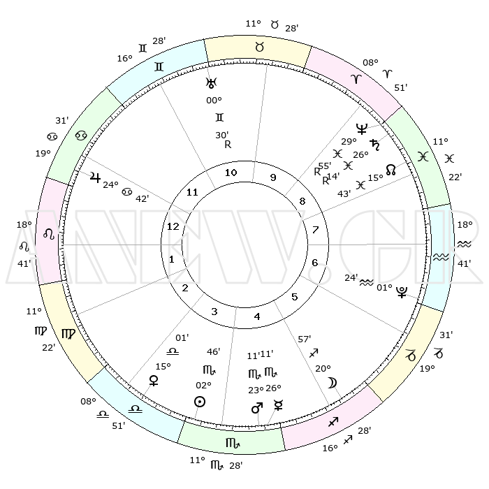 | | ΘΕΣΕΙΣ ΠΛΑΝΗΤΩΝ ΑΣΤΡΟΛΟΓΙΚΟΥ ΧΑΡΤΗ ΤΗΣ ΣΤΙΓΜΗΣ ΑΥΤΗΣ | | | | Πλανήτης | Ζώδιο | Μοίρες | Δεκαήμ. | Σε οίκο | Απόκλιση | | Ακμές των οίκων | | Ηλιος | Σκορπιός | 02°20' | Πρώτο | 8 | 12 S 17 | | 1ος | 15°08' | Υδροχόος | | Σελήνη | Τοξότης | 15°44' | Δεύτερο | 10 | 27 S 46 | | 2ος | 00°50' | Κριός | | Ερμής | Σκορπιός | 25°40' | Τρίτο | 9 | 21 S 45 | | 3ος | 06°32' | Ταύρος | | Αφροδίτη | Ζυγός | 14°28' | Δεύτερο | 8 | 04 S 18 | | 4ος | 02°40' | Δίδυμοι | | Αρης | Σκορπιός | 22°52' | Τρίτο | 9 | 18 S 48 | | 5ος | 24°37' | Δίδυμοι | | Δίας | Καρκίνος | 24°40' | Τρίτο | 6 | 21 N 15 | | 6ος | 16°52' | Καρκίνος | | Κρόνος | Ιχθείς | 26°15'R | Τρίτο | 1 | 03 S 46 | | 7ος | 15°08' | Λέων | | Ουρανός | Δίδυμοι | 00°31'R | Πρώτο | 3 | 20 N 03 | | 8ος | 00°50' | Ζυγός | | Ποσειδώνας | Ιχθείς | 29°56'R | Τρίτο | 1 | 01 S 17 | | 9ος | 06°32' | Σκορπιός | | Πλούτωνας | Υδροχόος | 01°24' | Πρώτο | 12 | 23 S 32 | | 10ος | 02°40' | Τοξότης | | Β. Δεσμός | Ιχθείς | 15°45' | Δεύτερο | 1 | 05 S 37 | | 11ος | 24°37' | Τοξότης | | Ωροσκόπος | Υδροχόος | 15°08' | Δεύτερο | | | 12ος | 16°52' | Αιγόκερως | | Μεσουράνημα | Τοξότης | 02°40' | Πρώτο | | | |