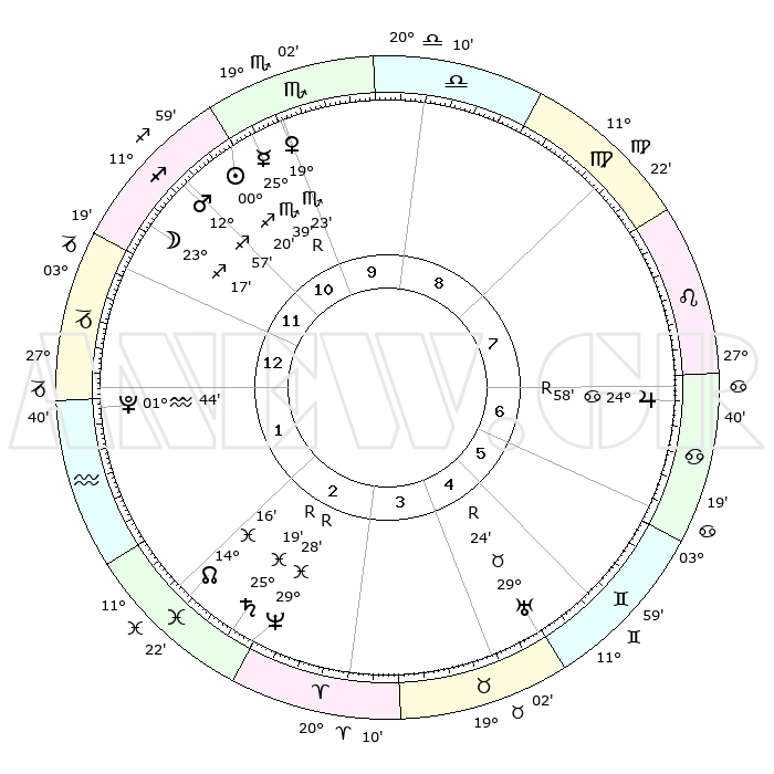| | ΘΕΣΕΙΣ ΠΛΑΝΗΤΩΝ ΑΣΤΡΟΛΟΓΙΚΟΥ ΧΑΡΤΗ ΤΗΣ ΣΤΙΓΜΗΣ ΑΥΤΗΣ | | | | Πλανήτης | Ζώδιο | Μοίρες | Δεκαήμ. | Σε οίκο | Απόκλιση | | Ακμές των οίκων | | Ηλιος | Τοξότης | 00°16' | Πρώτο | 11 | 20 S 12 | | 1ος | 05°53' | Αιγόκερως | | Σελήνη | Τοξότης | 22°35' | Τρίτο | 12 | 28 S 11 | | 2ος | 14°33' | Υδροχόος | | Ερμής | Σκορπιός | 25°44'R | Τρίτο | 11 | 18 S 03 | | 3ος | 24°49' | Ιχθείς | | Αφροδίτη | Σκορπιός | 19°19' | Δεύτερο | 10 | 16 S 36 | | 4ος | 27°46' | Κριός | | Αρης | Τοξότης | 12°55' | Δεύτερο | 11 | 22 S 56 | | 5ος | 23°11' | Ταύρος | | Δίας | Καρκίνος | 24°58'R | Τρίτο | 7 | 21 N 16 | | 6ος | 14°39' | Δίδυμοι | | Κρόνος | Ιχθείς | 25°19'R | Τρίτο | 3 | 04 S 04 | | 7ος | 05°53' | Καρκίνος | | Ουρανός | Ταύρος | 29°24'R | Τρίτο | 5 | 19 N 49 | | 8ος | 14°33' | Λέων | | Ποσειδώνας | Ιχθείς | 29°28'R | Τρίτο | 3 | 01 S 28 | | 9ος | 24°49' | Παρθένος | | Πλούτωνας | Υδροχόος | 01°44' | Πρώτο | 1 | 23 S 26 | | 10ος | 27°46' | Ζυγός | | Β. Δεσμός | Ιχθείς | 14°16' | Δεύτερο | 2 | 06 S 11 | | 11ος | 23°11' | Σκορπιός | | Ωροσκόπος | Αιγόκερως | 05°53' | Πρώτο | | | 12ος | 14°39' | Τοξότης | | Μεσουράνημα | Ζυγός | 27°46' | Τρίτο | | | |