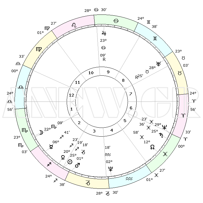 | | ΘΕΣΕΙΣ ΠΛΑΝΗΤΩΝ ΑΣΤΡΟΛΟΓΙΚΟΥ ΧΑΡΤΗ ΤΗΣ ΣΤΙΓΜΗΣ ΑΥΤΗΣ | | | | Πλανήτης | Ζώδιο | Μοίρες | Δεκαήμ. | Σε οίκο | Απόκλιση | | Ακμές των οίκων | | Ηλιος | Τοξότης | 24°59' | Τρίτο | 6 | 23 S 20 | | 1ος | 18°31' | Καρκίνος | | Σελήνη | Σκορπιός | 18°15' | Δεύτερο | 5 | 21 S 38 | | 2ος | 09°01' | Λέων | | Ερμής | Τοξότης | 06°14' | Πρώτο | 5 | 20 S 02 | | 3ος | 02°34' | Παρθένος | | Αφροδίτη | Τοξότης | 19°58' | Δεύτερο | 6 | 22 S 57 | | 4ος | 01°57' | Ζυγός | | Αρης | Αιγόκερως | 01°03' | Πρώτο | 6 | 24 S 13 | | 5ος | 07°53' | Σκορπιός | | Δίας | Καρκίνος | 23°11'R | Τρίτο | 1 | 21 N 38 | | 6ος | 15°31' | Τοξότης | | Κρόνος | Ιχθείς | 25°35' | Τρίτο | 9 | 03 S 53 | | 7ος | 18°31' | Αιγόκερως | | Ουρανός | Ταύρος | 28°26'R | Τρίτο | 11 | 19 N 37 | | 8ος | 09°01' | Υδροχόος | | Ποσειδώνας | Ιχθείς | 29°23' | Τρίτο | 9 | 01 S 29 | | 9ος | 02°34' | Ιχθείς | | Πλούτωνας | Υδροχόος | 02°17' | Πρώτο | 7 | 23 S 19 | | 10ος | 01°57' | Κριός | | Β. Δεσμός | Ιχθείς | 12°59' | Δεύτερο | 9 | 06 S 41 | | 11ος | 07°53' | Ταύρος | | Ωροσκόπος | Καρκίνος | 18°31' | Δεύτερο | | | 12ος | 15°31' | Δίδυμοι | | Μεσουράνημα | Κριός | 01°57' | Πρώτο | | | |