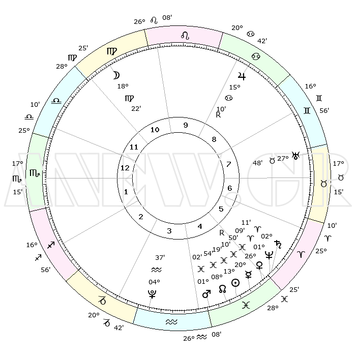 | | ΘΕΣΕΙΣ ΠΛΑΝΗΤΩΝ ΑΣΤΡΟΛΟΓΙΚΟΥ ΧΑΡΤΗ ΤΗΣ ΣΤΙΓΜΗΣ ΑΥΤΗΣ | | | | Πλανήτης | Ζώδιο | Μοίρες | Δεκαήμ. | Σε οίκο | Απόκλιση | | Ακμές των οίκων | | Ηλιος | Ιχθείς | 13°14' | Δεύτερο | 5 | 06 S 35 | | 1ος | 25°05' | Ζυγός | | Σελήνη | Παρθένος | 17°21' | Δεύτερο | 11 | 04 N 17 | | 2ος | 23°12' | Σκορπιός | | Ερμής | Ιχθείς | 20°14'R | Τρίτο | 5 | 00 S 32 | | 3ος | 24°48' | Τοξότης | | Αφροδίτη | Ιχθείς | 26°44' | Τρίτο | 5 | 02 S 30 | | 4ος | 28°41' | Αιγόκερως | | Αρης | Ιχθείς | 00°59' | Πρώτο | 4 | 12 S 09 | | 5ος | 01°38' | Ιχθείς | | Δίας | Καρκίνος | 15°10'R | Δεύτερο | 9 | 22 N 55 | | 6ος | 00°43' | Κριός | | Κρόνος | Κριός | 02°11' | Πρώτο | 6 | 01 S 05 | | 7ος | 25°05' | Κριός | | Ουρανός | Ταύρος | 27°48' | Τρίτο | 8 | 19 N 29 | | 8ος | 23°12' | Ταύρος | | Ποσειδώνας | Κριός | 01°09' | Πρώτο | 6 | 00 S 44 | | 9ος | 24°48' | Δίδυμοι | | Πλούτωνας | Υδροχόος | 04°37' | Πρώτο | 4 | 22 S 52 | | 10ος | 28°41' | Καρκίνος | | Β. Δεσμός | Ιχθείς | 08°54' | Πρώτο | 5 | 08 S 14 | | 11ος | 01°38' | Παρθένος | | Ωροσκόπος | Ζυγός | 25°05' | Τρίτο | | | 12ος | 00°43' | Ζυγός | | Μεσουράνημα | Καρκίνος | 28°41' | Τρίτο | | | |
