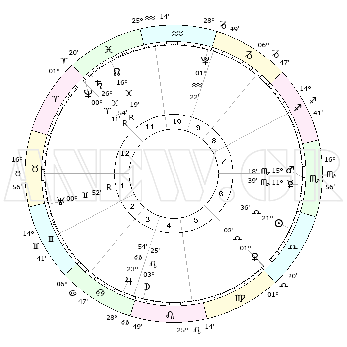 | ΘΕΣΕΙΣ ΠΛΑΝΗΤΩΝ ΑΣΤΡΟΛΟΓΙΚΟΥ ΧΑΡΤΗ ΤΗΣ ΣΤΙΓΜΗΣ ΑΥΤΗΣ | | Πλανήτης | Ζώδιο | Μοίρες | Δεκαήμ. | Σε οίκο | Απόκλιση | | Ακμές των οίκων | Ηλιος | Ζυγός | 21°26' | Τρίτο | 8 | 08 S 21 | | 1ος | 14°23' | Υδροχόος | Σελήνη | Λέων | 01°10' | Πρώτο | 6 | 23 N 36 | | 2ος | 00°03' | Κριός | Ερμής | Σκορπιός | 11°25' | Δεύτερο | 9 | 16 S 51 | | 3ος | 05°53' | Ταύρος | Αφροδίτη | Ζυγός | 00°49' | Πρώτο | 8 | 01 N 04 | | 4ος | 02°07' | Δίδυμοι | Αρης | Σκορπιός | 15°11' | Δεύτερο | 9 | 16 S 36 | | 5ος | 24°06' | Δίδυμοι | Δίας | Καρκίνος | 23°53' | Τρίτο | 6 | 21 N 22 | | 6ος | 16°18' | Καρκίνος | Κρόνος | Ιχθείς | 26°55'R | Τρίτο | 1 | 03 S 31 | | 7ος | 14°23' | Λέων | Ουρανός | Δίδυμοι | 00°52'R | Πρώτο | 3 | 20 N 07 | | 8ος | 00°03' | Ζυγός | Ποσειδώνας | Κριός | 00°11'R | Πρώτο | 2 | 01 S 11 | | 9ος | 05°53' | Σκορπιός | Πλούτωνας | Υδροχόος | 01°22' | Πρώτο | 12 | 23 S 32 | | 10ος | 02°07' | Τοξότης | Β. Δεσμός | Ιχθείς | 16°19' | Δεύτερο | 1 | 05 S 24 | | 11ος | 24°06' | Τοξότης | Ωροσκόπος | Υδροχόος | 14°23' | Δεύτερο | | | 12ος | 16°18' | Αιγόκερως | Μεσουράνημα | Τοξότης | 02°07' | Πρώτο | | | |